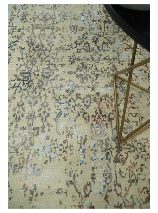 8x10 Beige, Blue and Silver Antique Style, Abstract Hand Knotted Low pile Wool Area Rug