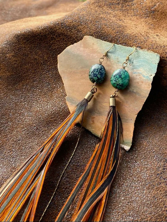 Turquoise Stone & Fawn Long Feather Earrings