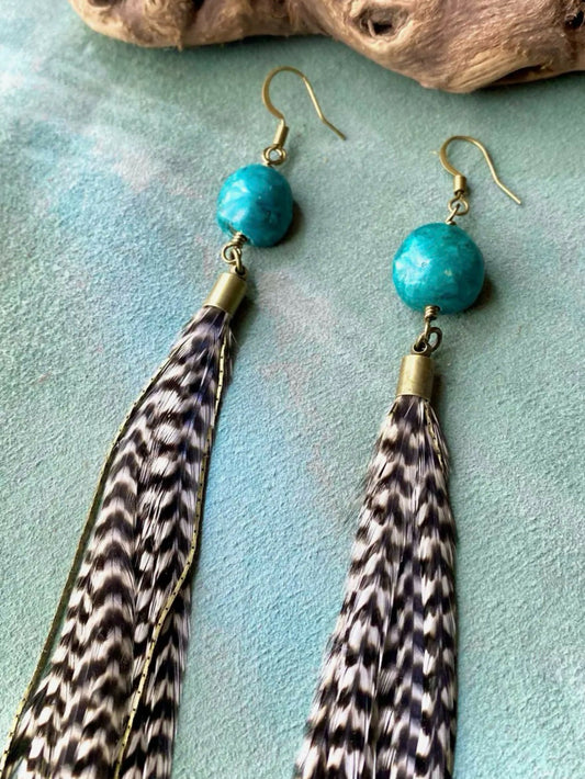Turquoise Stone & Grizzly Long Feather Earrings