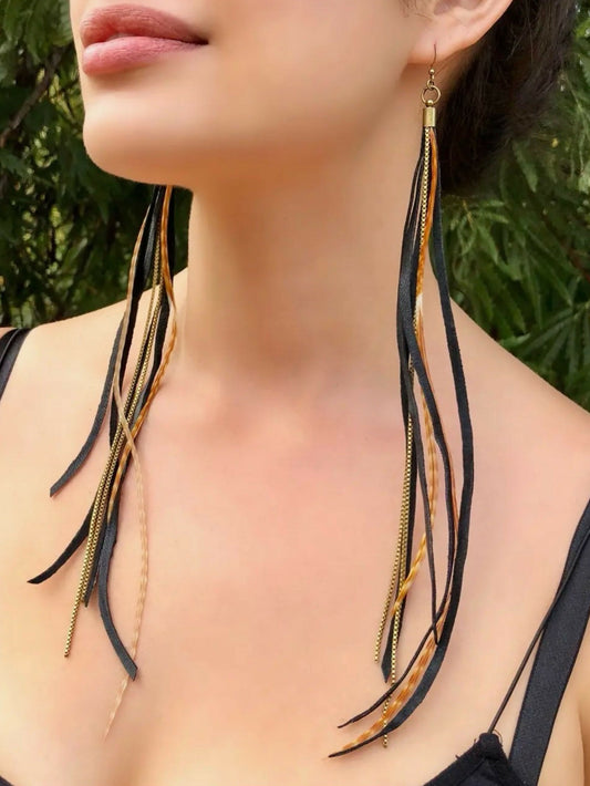 Black Leather & Feather Long Dangle Earrings