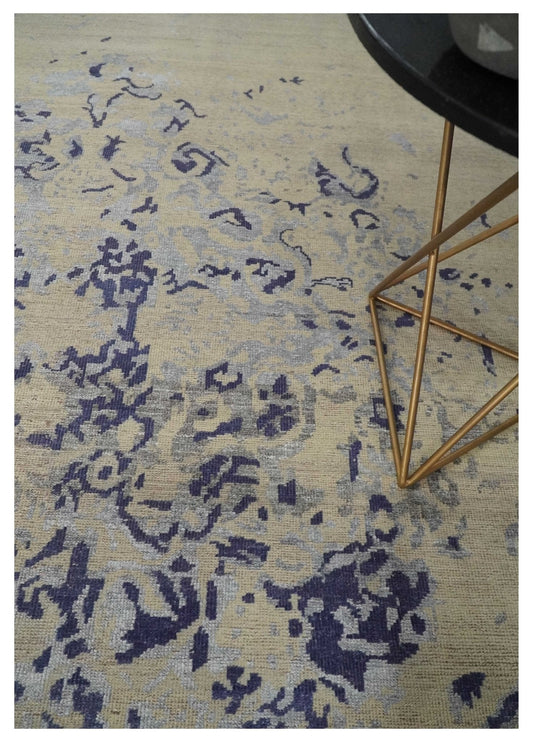 8x10 Beige, Blue and Silver Antique Style, Abstract Hand Knotted Low pile Wool Area Rug