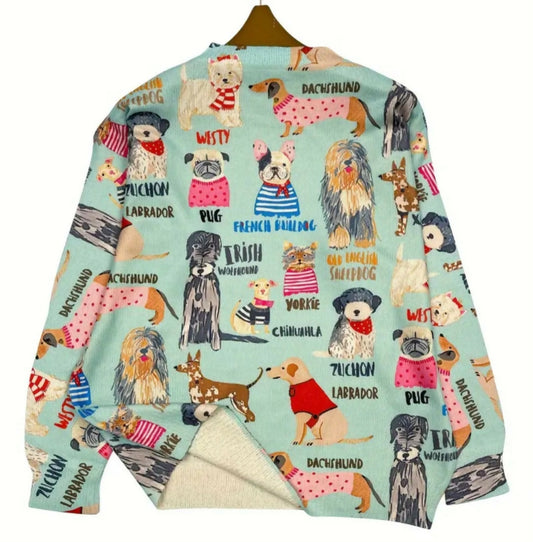Anytime Crystals Aqua Dog Breeds Print Long Sleeve Sweater