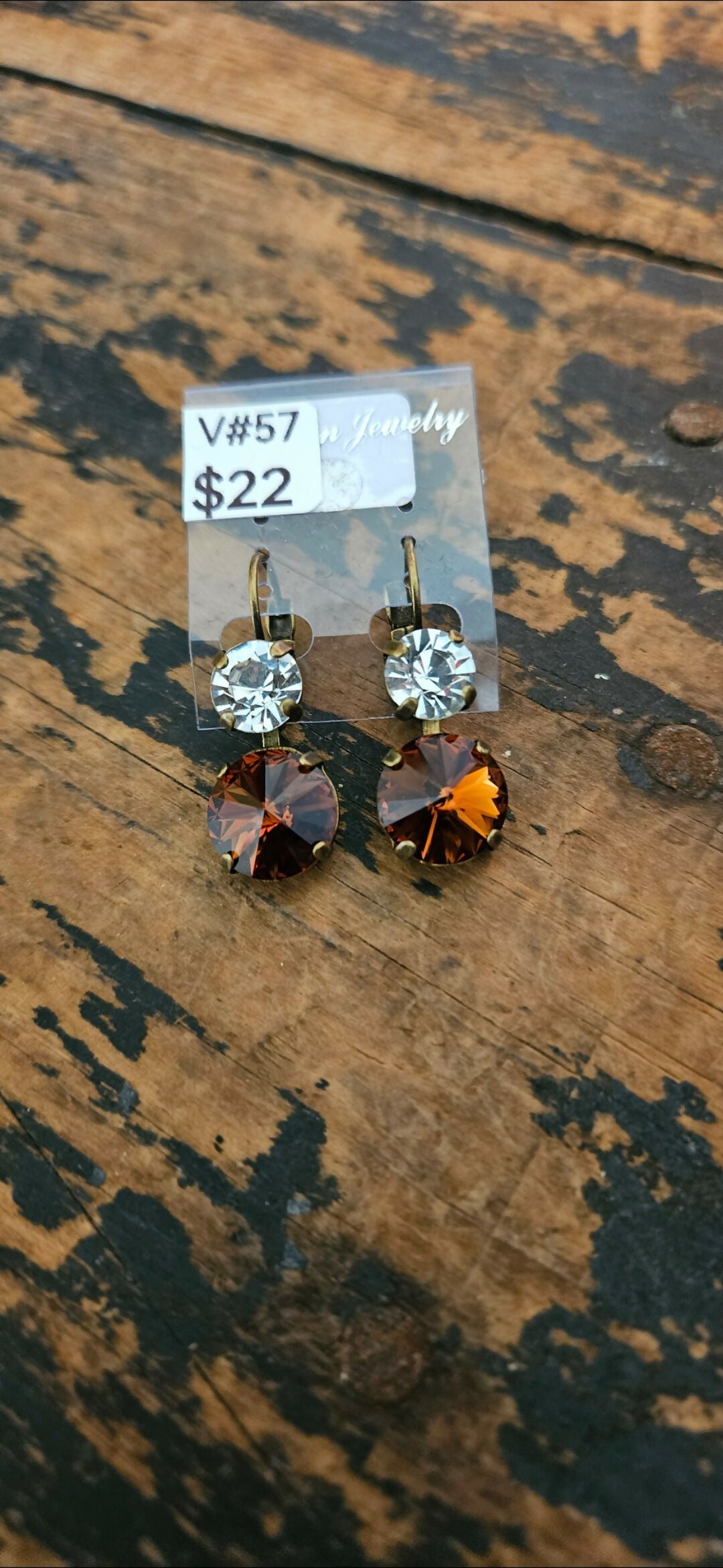 Anytime Crystals is offering these 8.5 & 10mm Crystal Clear & Brown Swarovski Crystal earrings in a brass setting. This pair features a lever back design with a 1.25" drop.