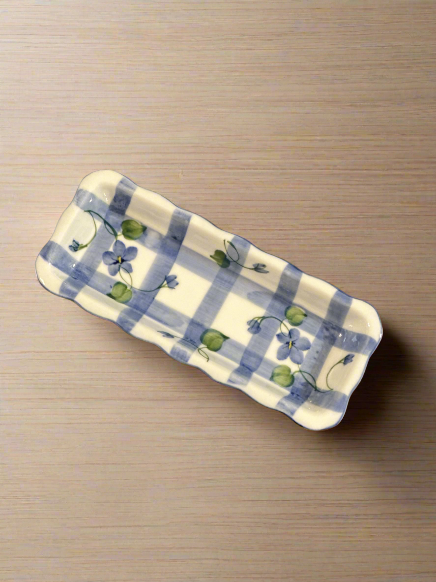 A decorative, possibly vintage, serving dish or tray. It features a scalloped edge and a hand-painted blue lattice pattern with blue flowers and green leaves.