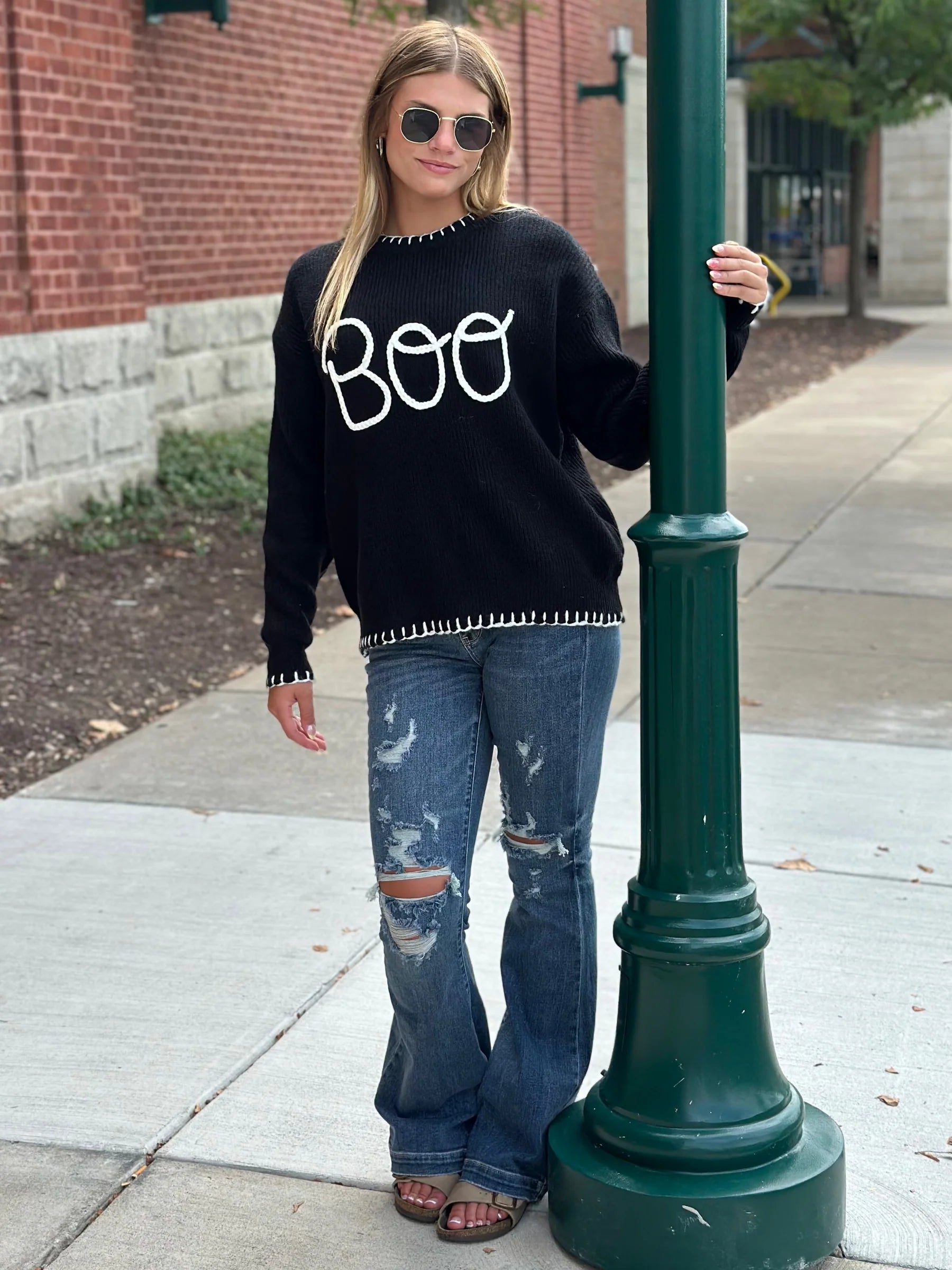 Celebrate the spooky season in style with our "Boo" sweater! Featuring 3D braided writing and contrast stitching, it's the perfect combination of spooky and chic. Stay warm and fashionable this Halloween!