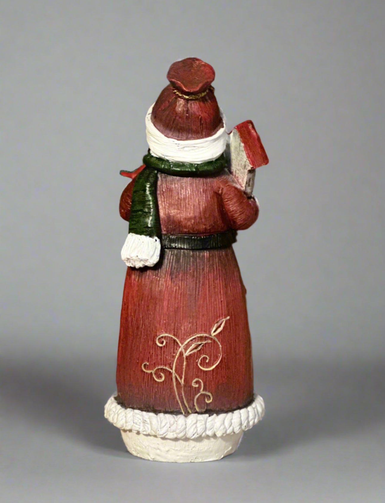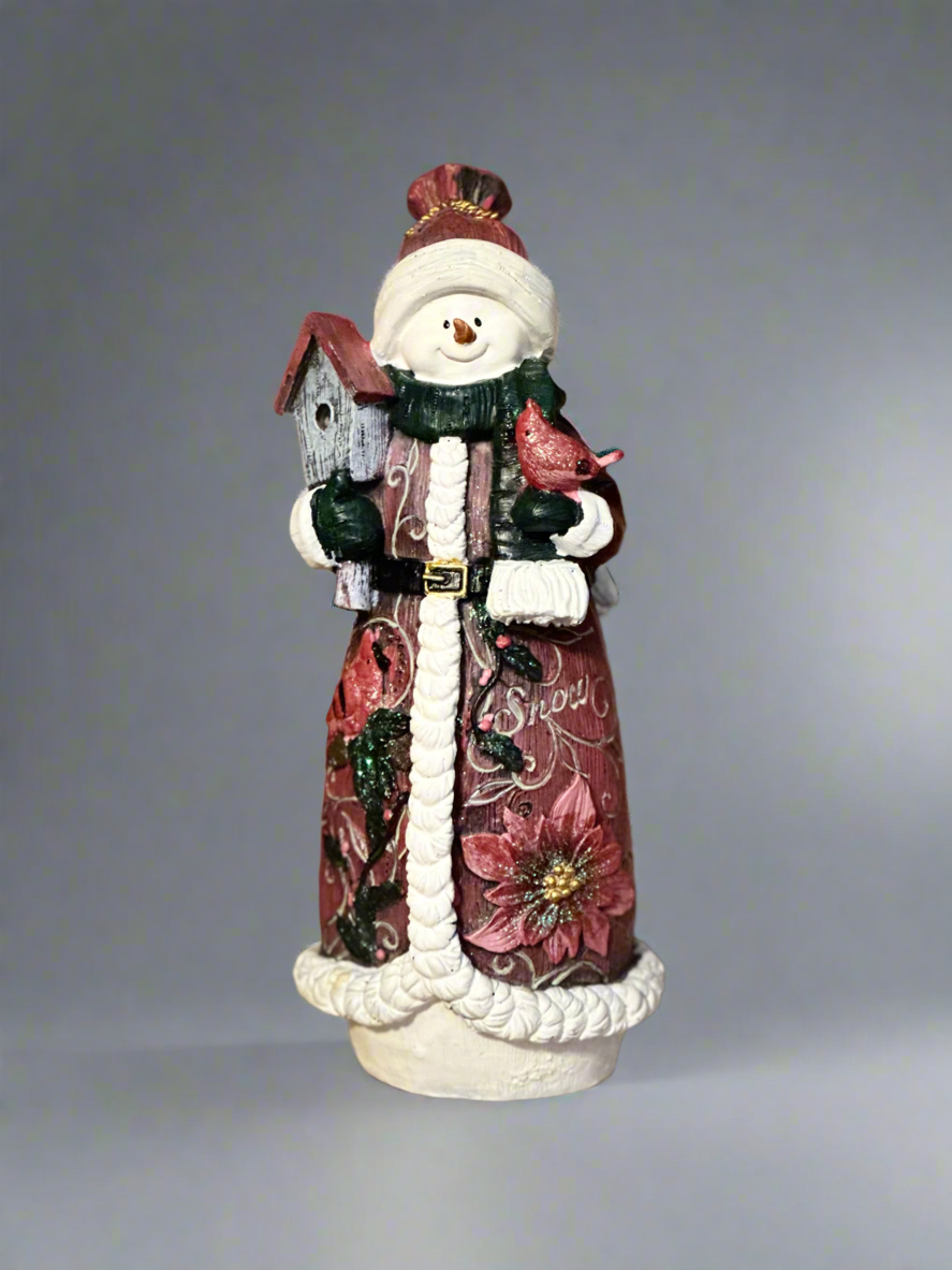 This charming snowman resin figurine brings warmth to winter with its rustic details and rich colors. Dressed in a deep cranberry coat adorned with glittered poinsettias and elegant vines, he holds a cozy birdhouse in one hand and a bright red cardinal in the other — a sweet symbol of love and remembrance during the holiday season. Accented with a soft white trim and vintage-style finish, this piece adds a timeless, heartwarming touch to any holiday display or gift collection.
