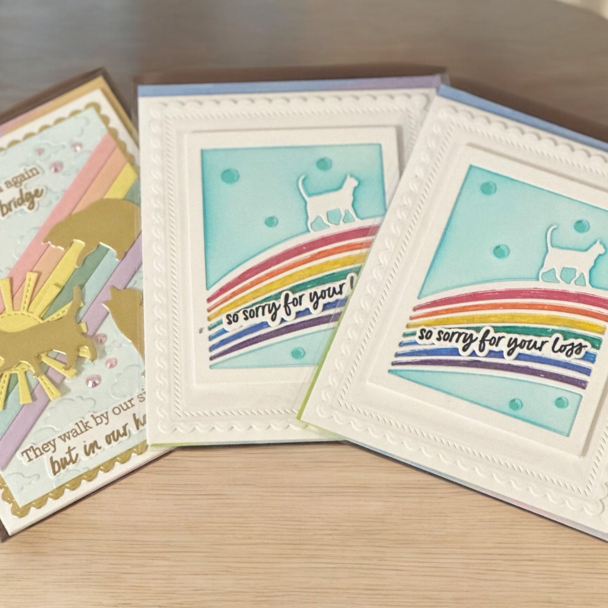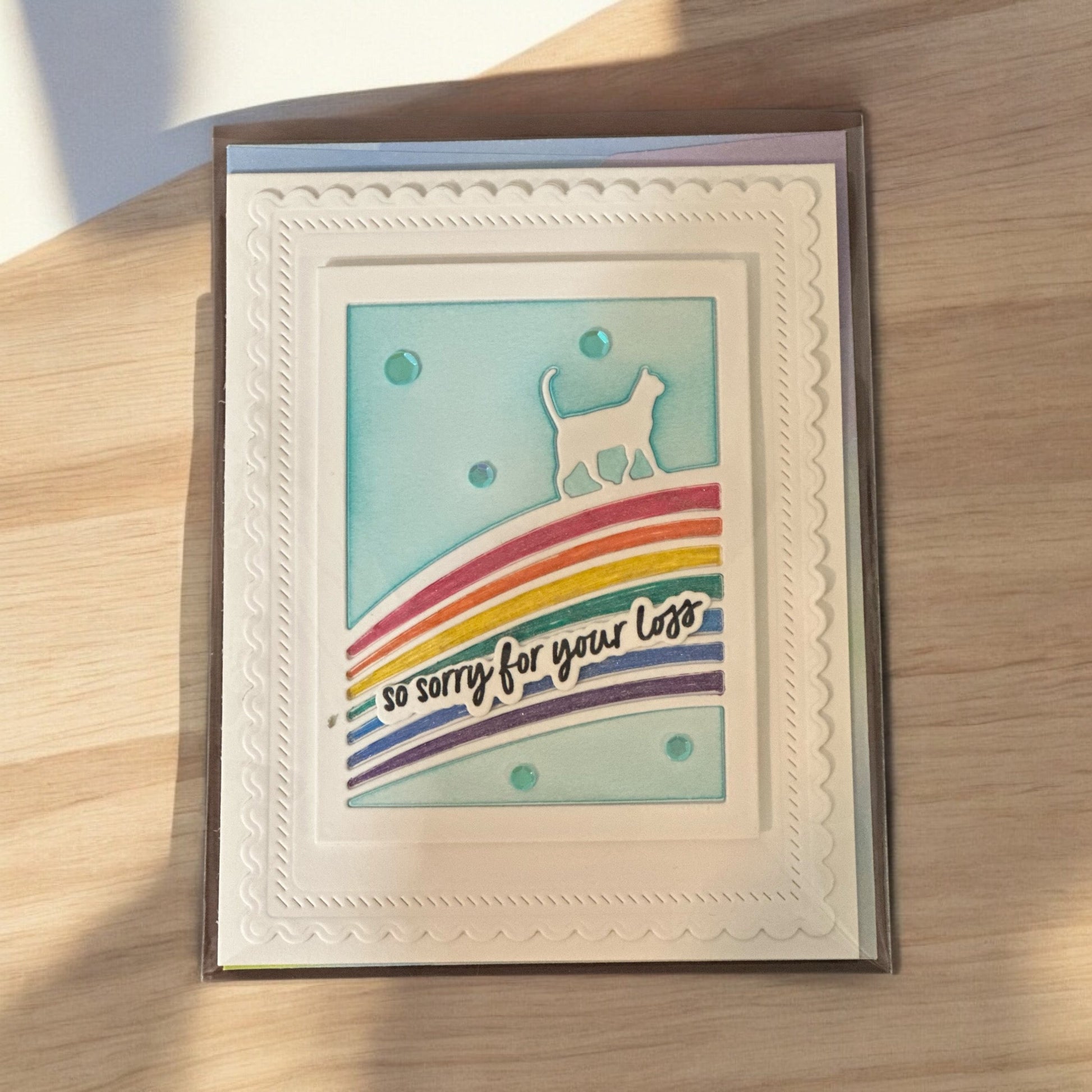 Share comfort and compassion with this locally handcrafted sympathy card from Paper Hugs Greetings in Canonsburg, PA. Designed for someone who has lost a beloved cat, each multi-layered card is adorned with delicate hand-applied gems, creating an elegant and heartfelt expression of solace.