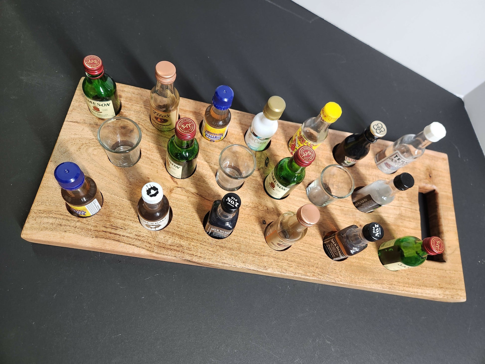 Solid Acacia wood Char-shooterie board 21"x8"x1" thick. Be a big hit at your next party. Holds up to 19 mini bottles or shot glasses. Personalization (laser engraving) available for additional fee.