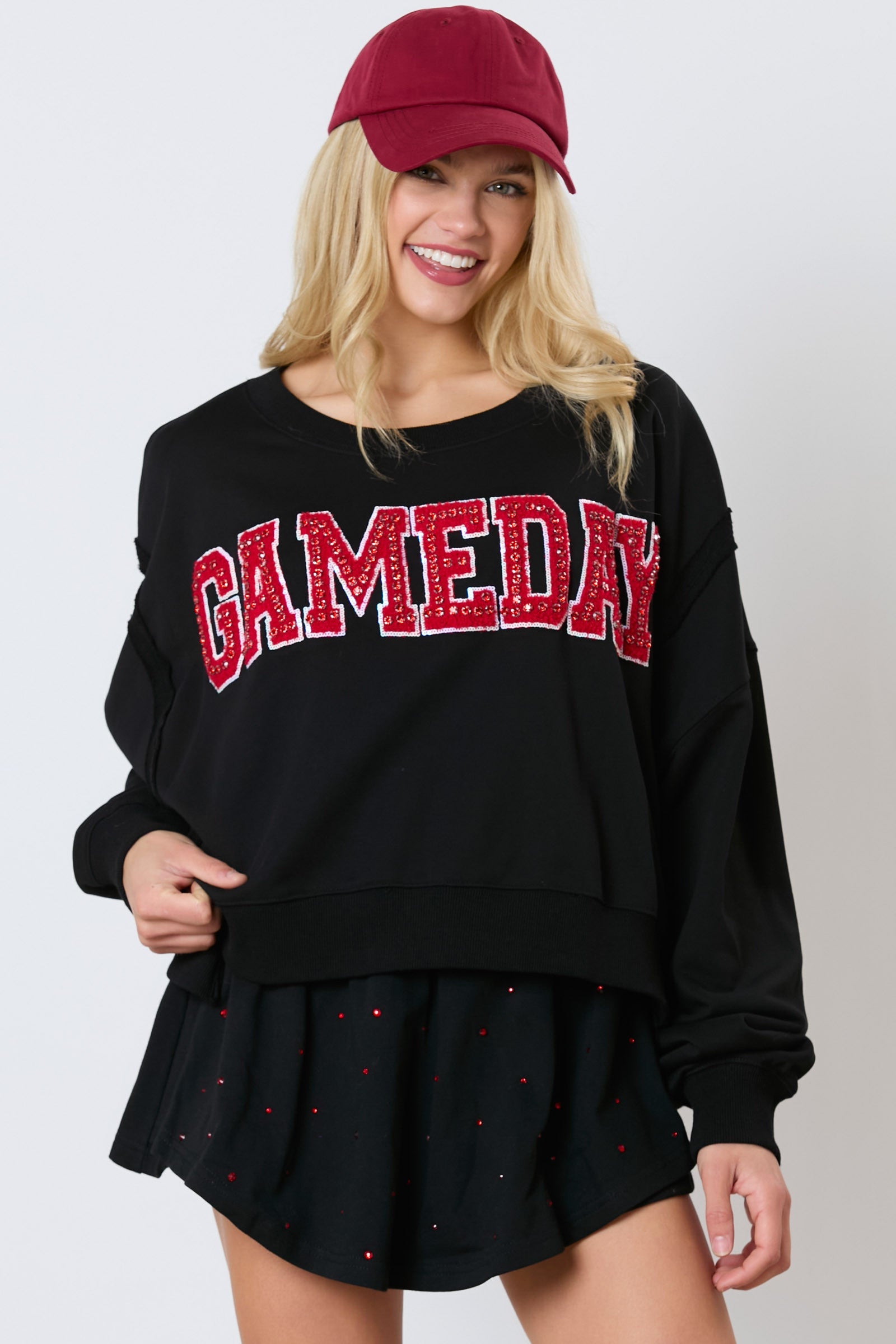 Get ready for game day with this playful top! Featuring a crystal stone embroidery design and outseam detail, you'll stand out from the crowd. The round neck and long sleeves offer comfort, while the asymmetric high-low cut adds a unique touch. Perfect for showing off your fun and quirky style!