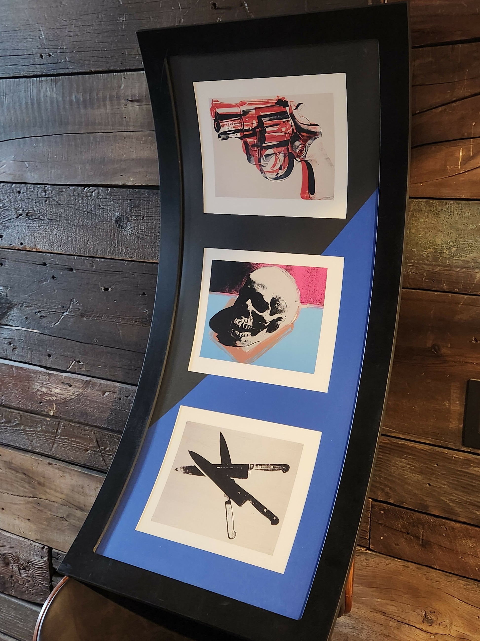 Curved Picture Frame with print of (3) Andy Warhol prints. Black wood frame.