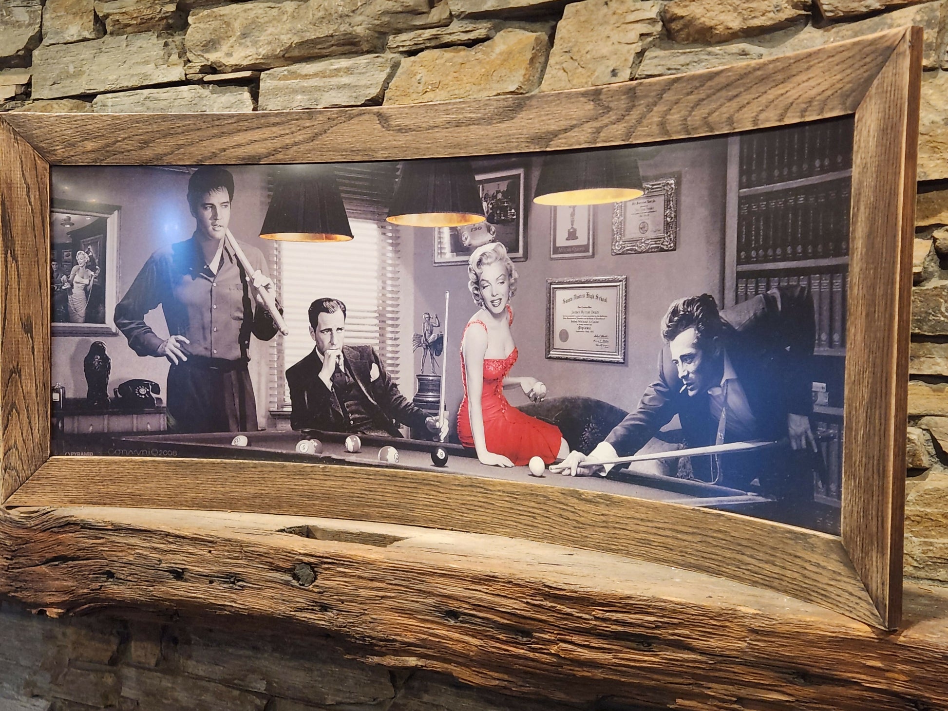Curved Picture Frame with print Marilyn Monroe, James Dean, Humphrey Bogart and Elvis. rustic wood frame.