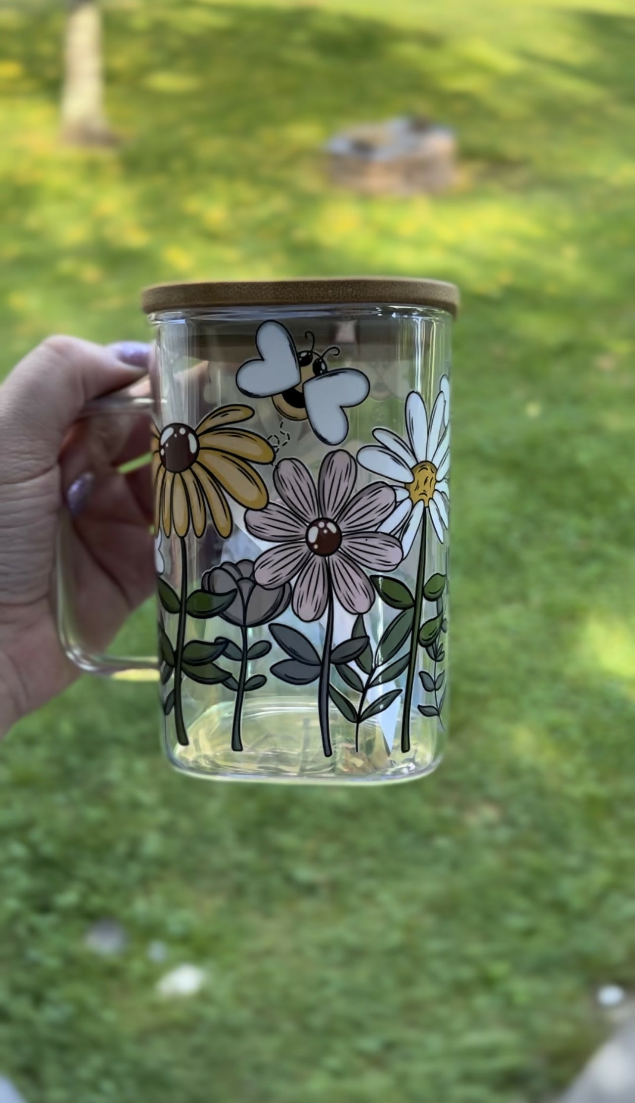 20 oz irridesent glass mug with a daisy and bee wrap.