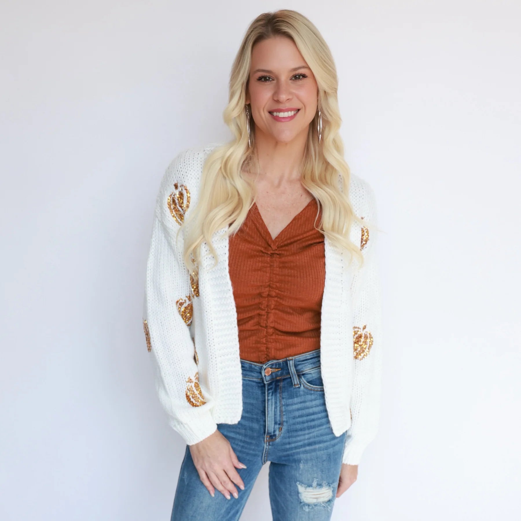 Introducing our Dazzle me with Pumpkins Sweater Cardigan. This luxurious sweater features a soft, embroidered sequin pumpkin design that will add a touch of glam to any outfit. Cozy up in style with this sophisticated and exclusive piece.