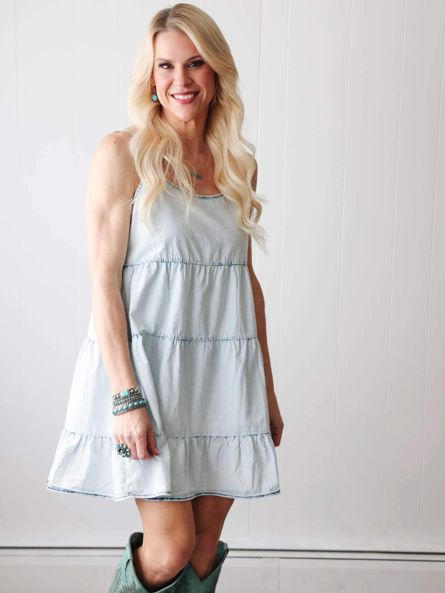 Introducing the Denim Darling – the cutest and most comfortable tiered dress you'll ever own! Made from 100% cotton, this light denim dress features a scoop neckline and adjustable straps for the perfect fit. Get ready to rock a flowy, flirty look that's perfect for any occasion!
