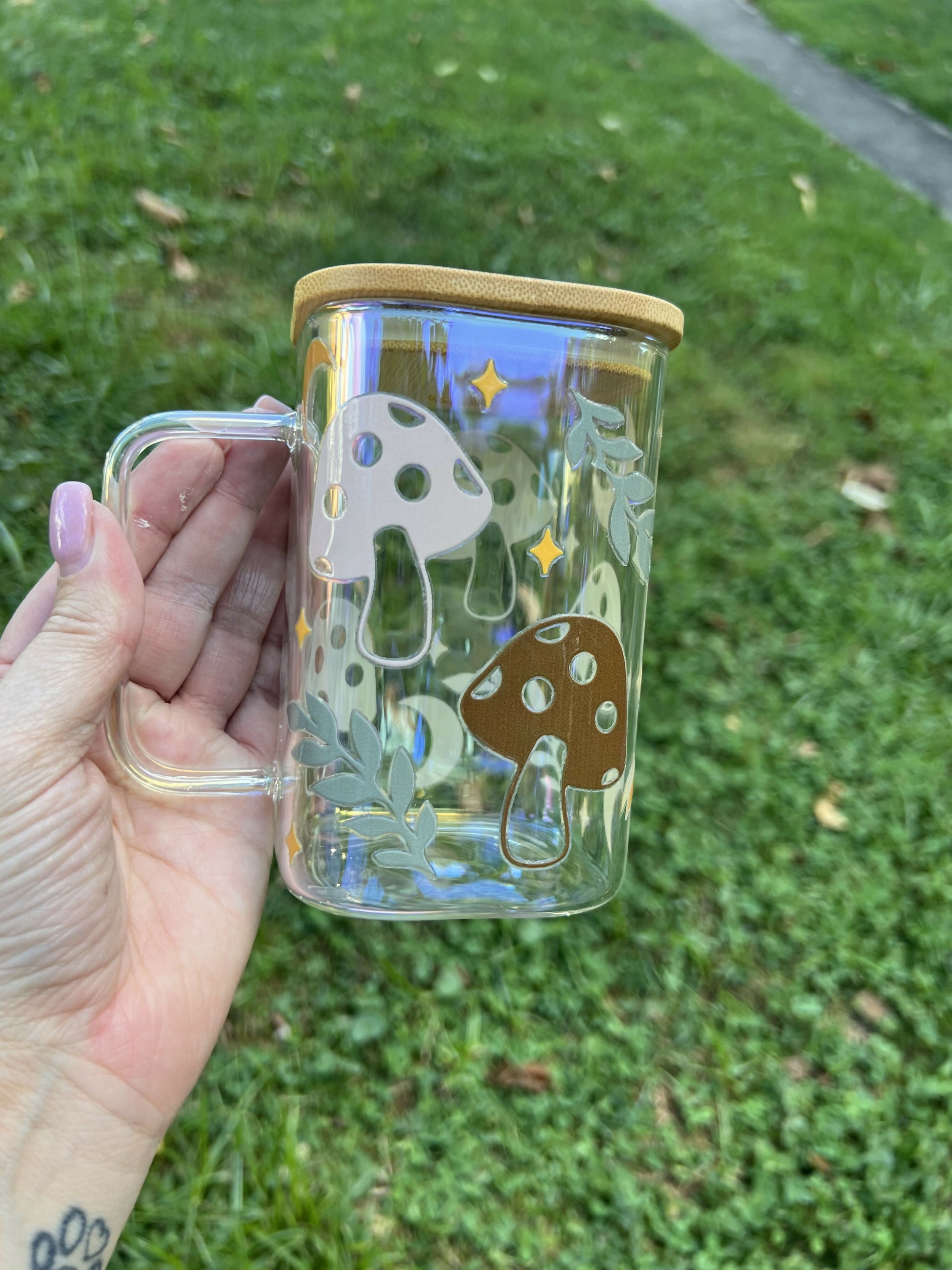 17oz square iridescent glass mug with mushroom decal.