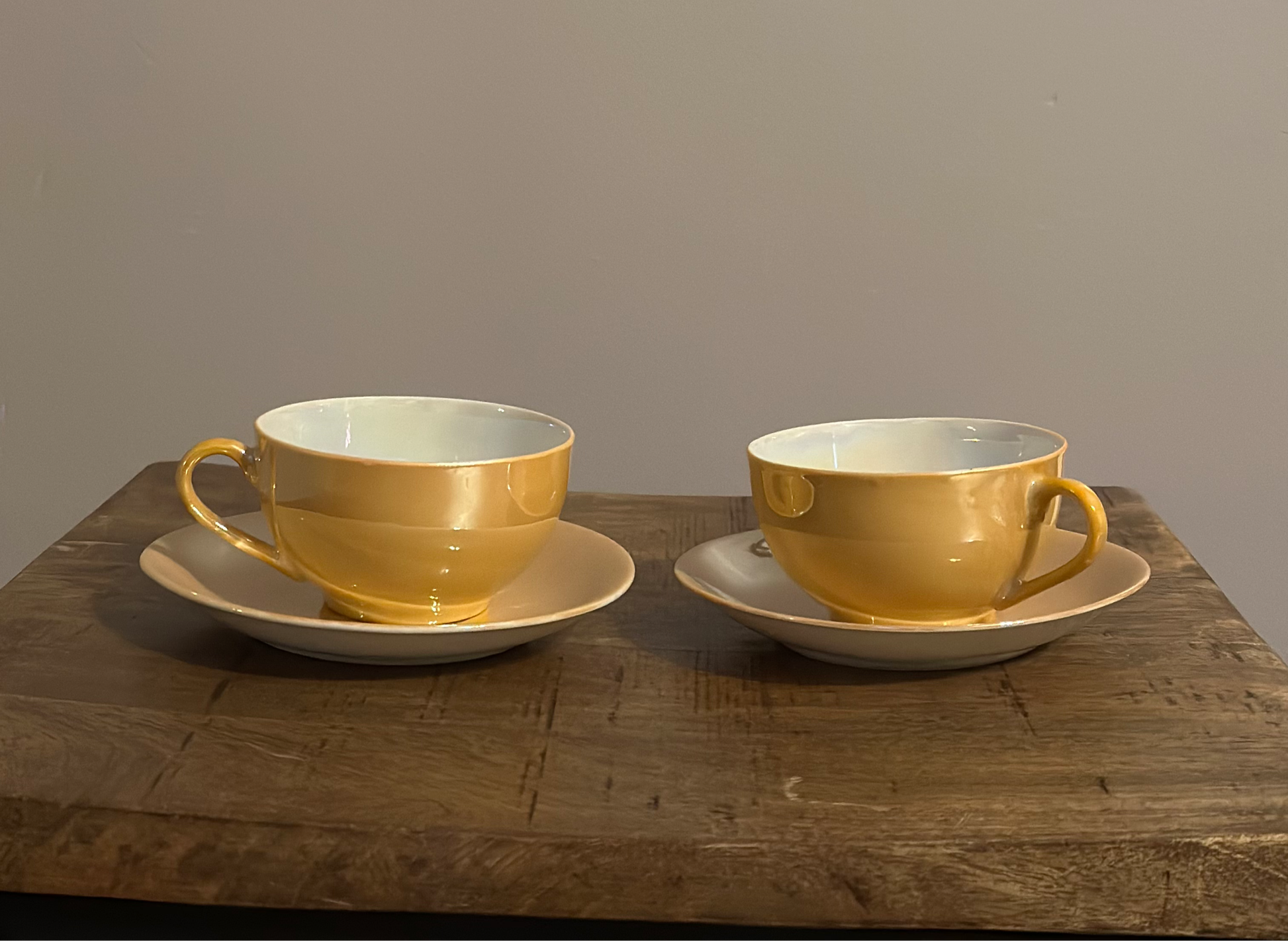Tea cup & saucer, color gold with white inside the cup.