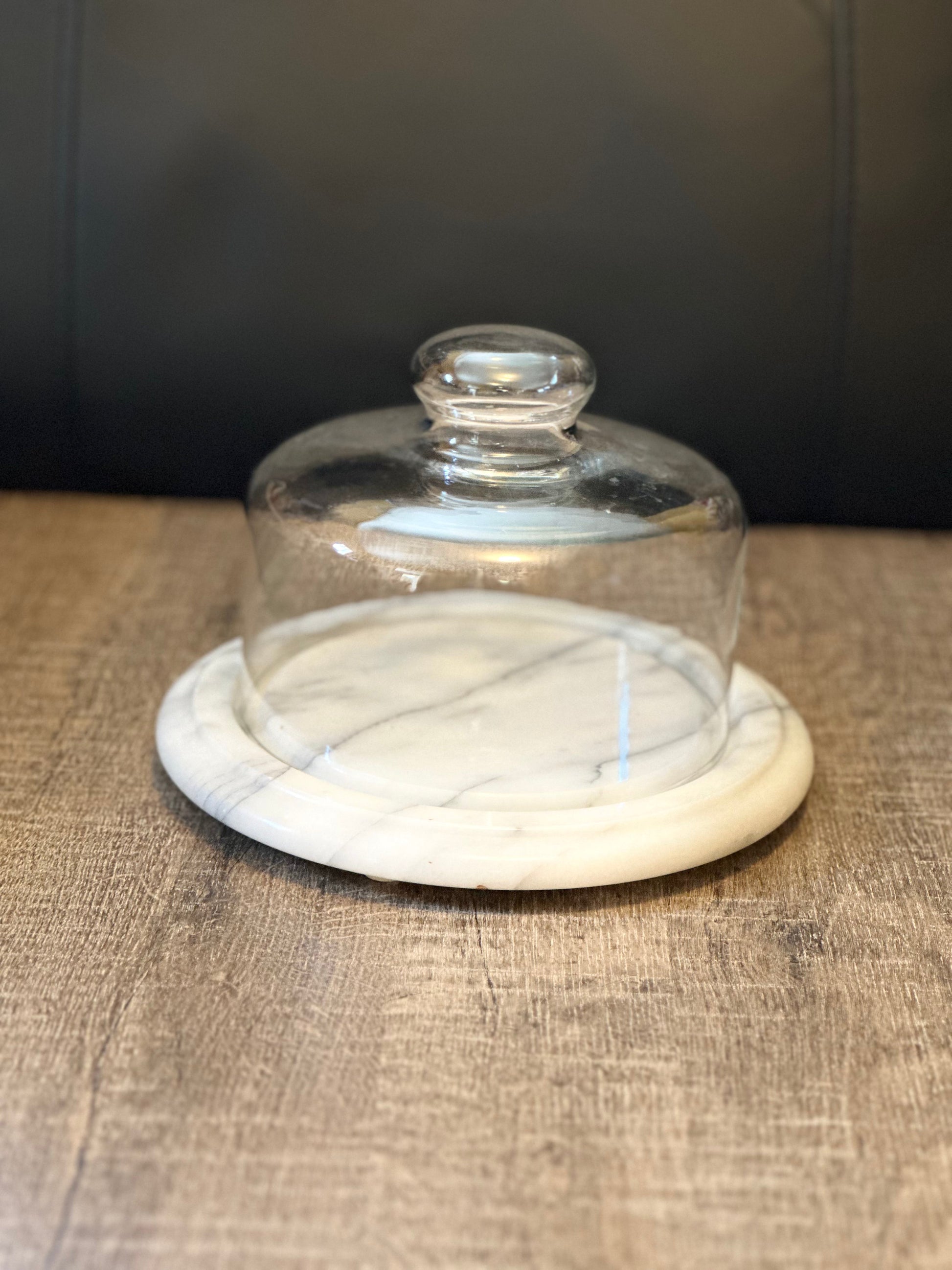 Grey Marble Footed Cheeseboard and Glass Cloche/Dome with Wide Knob. Vintage marble cheese cloche in great condition! No chips or cracks. Very slight ruff edge noted in pictures. Measures 7” across marble and 7 1/2” high