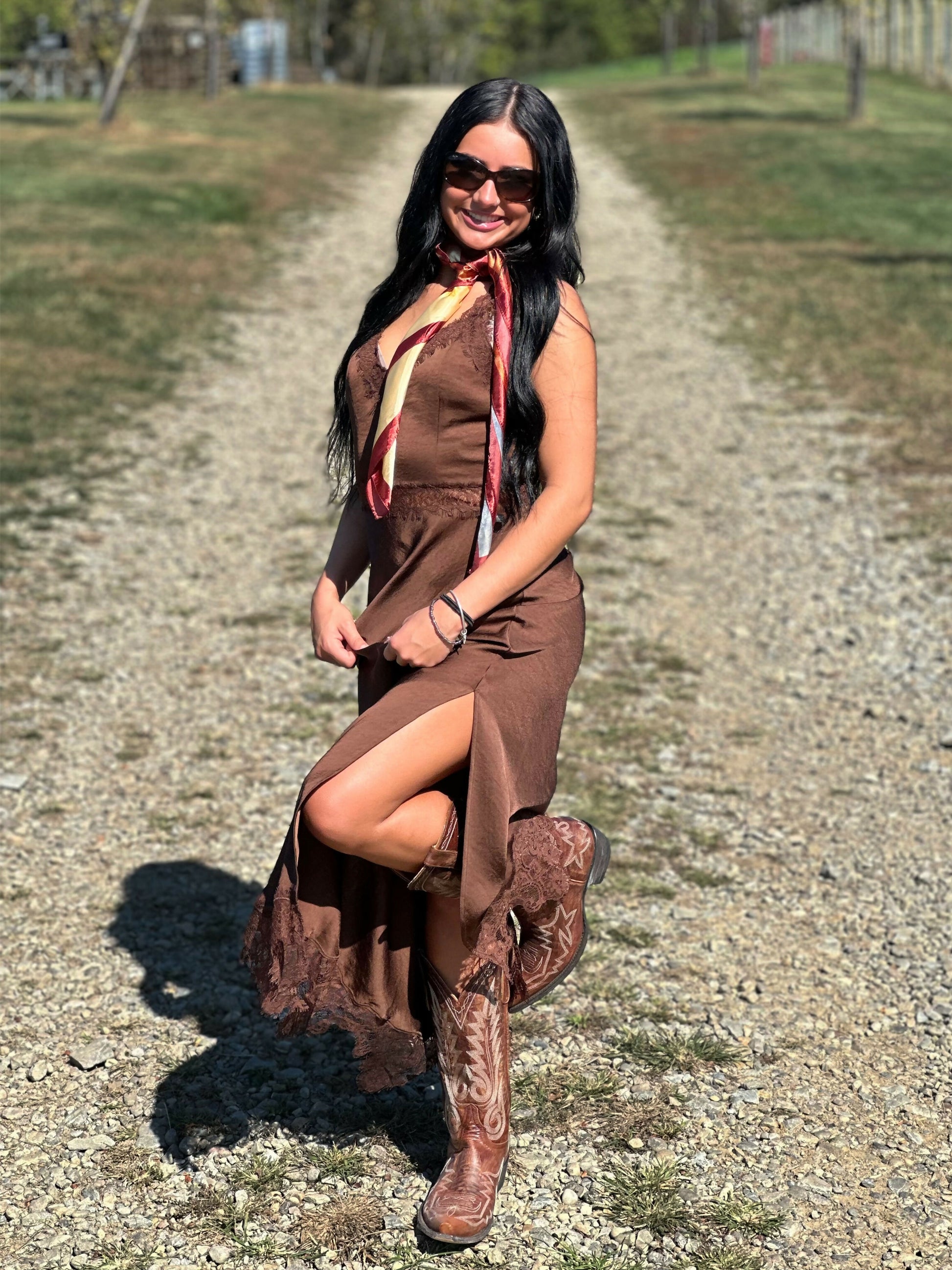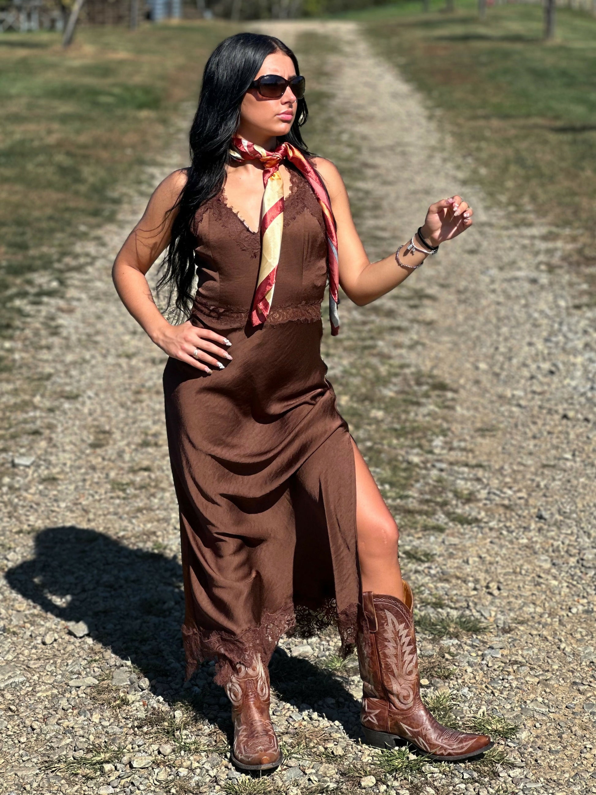 Transform any special occasion with the Brown Satin Side Slit Maxi Dress. This stunning formal gown features luxurious chocolate brown satin fabric that delivers a high-shine, elegant finish. Delicate lace trim detailing adds romantic sophistication, while the dramatic side slit creates beautiful movement and a flattering, elongated silhouette. The secure back zipper closure ensures a seamless fit, and the dress runs true to size for easy, confident ordering. Perfect for weddings, formal events, evening galas, prom, and bridesmaid duties, this floor-length dress combines timeless elegance with modern glamour.