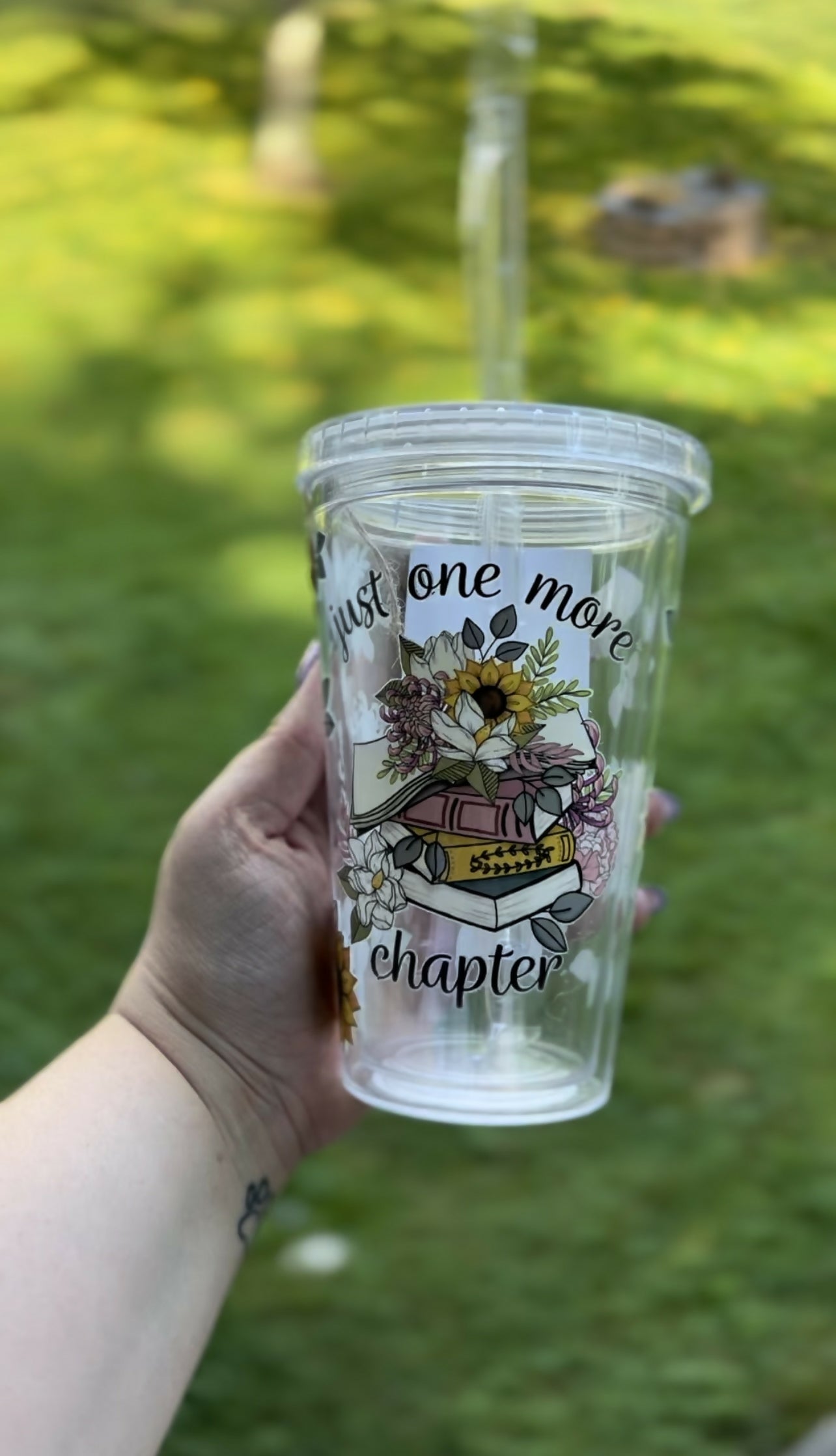 16 oz acrylic tumbler with a flower and book wrap that has the quote "just one more chapter".