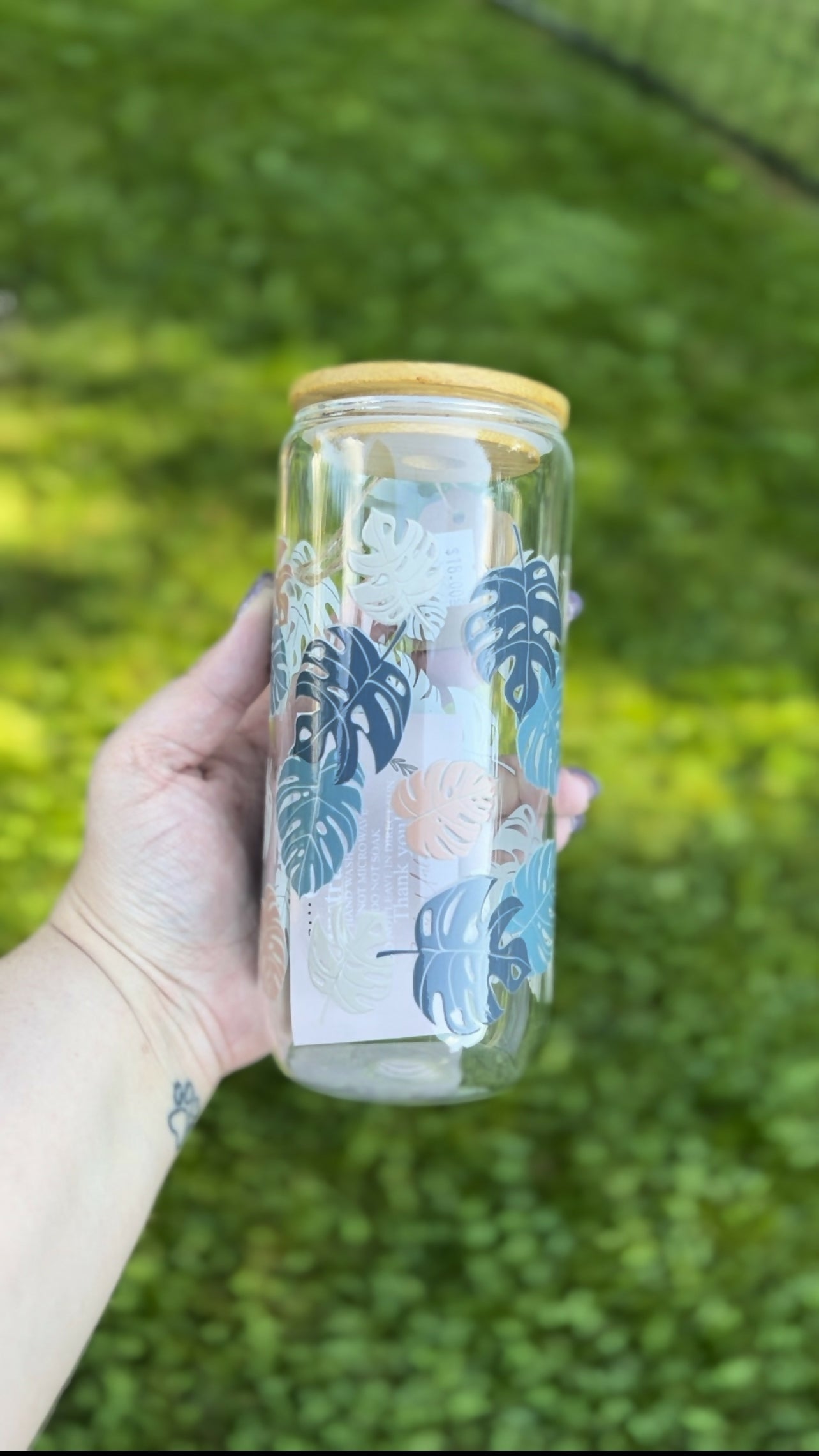 20 oz glass can tumbler with a monstera decal wrap.