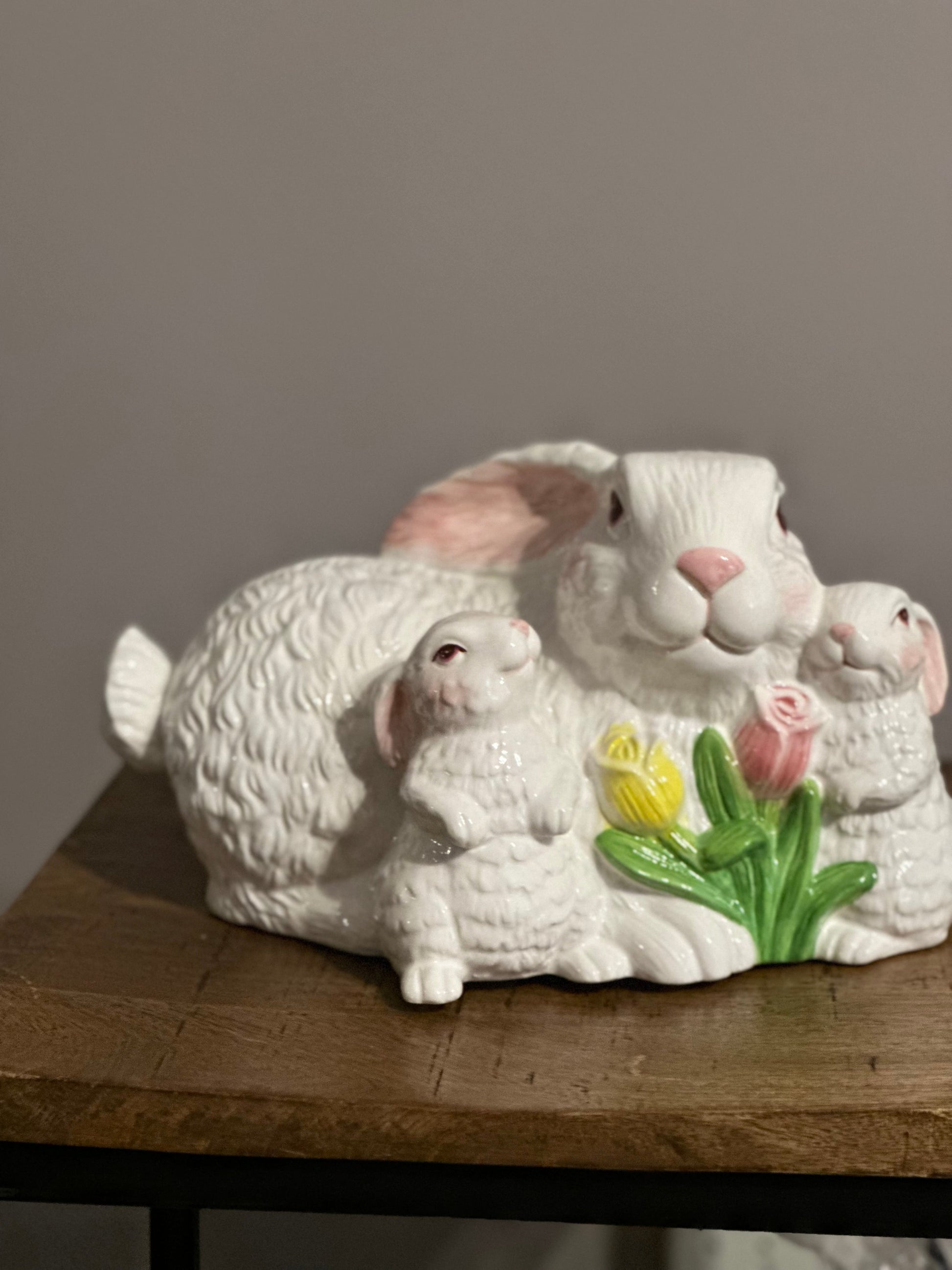 Vintage ceramic centerpiece featuring a mother bunny with two baby bunnies and flowers. It is designed for springtime or Easter holiday decoration.