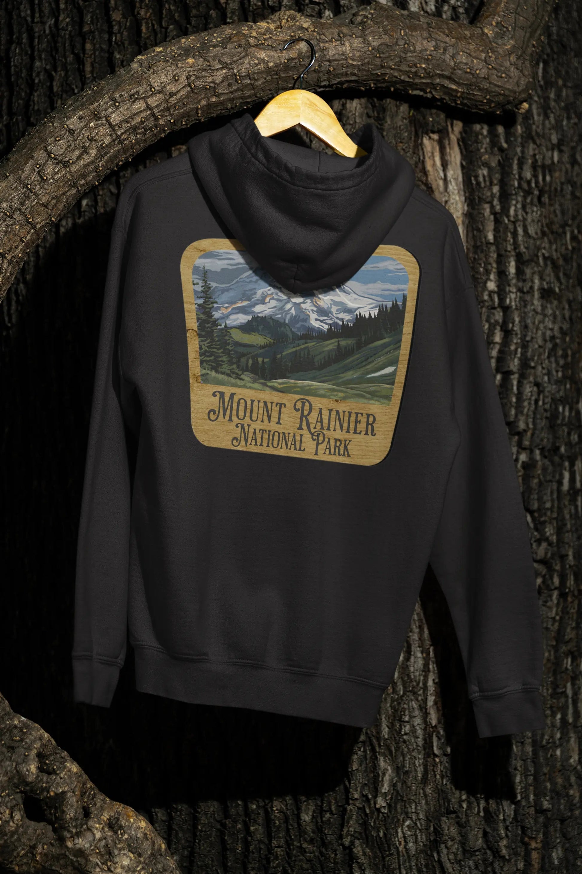 Mount Rainier National Park Fleece Hoodie Unisex Fit Scenic Wooden Mountain Sign