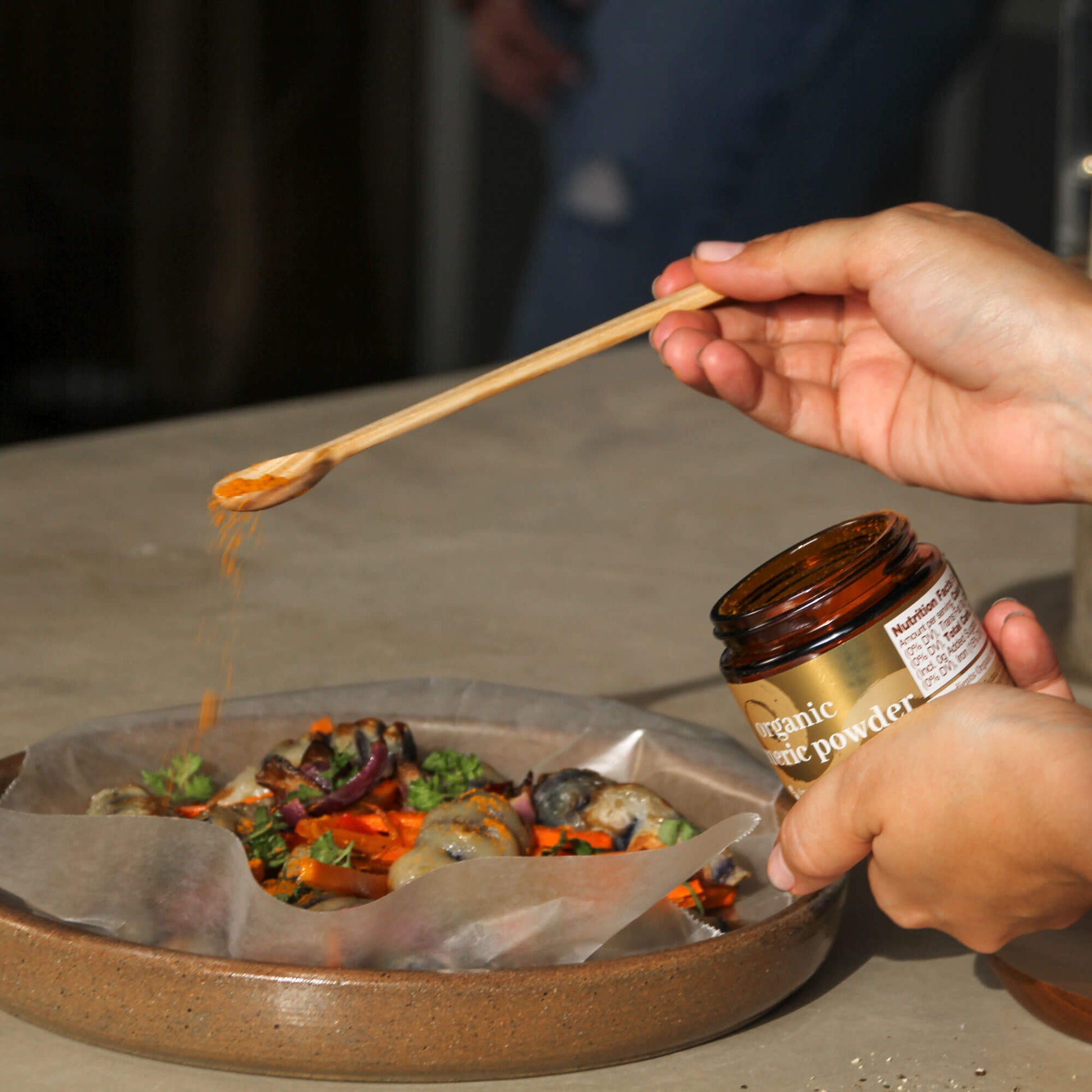 Our Organic Turmeric Powder is kitchen essential for adding warmth and vibrancy to your culinary creations. Sourced from organically grown turmeric, this golden powder is a versatile spice with a mild, earthy flavor. Elevate your dishes with a sprinkle of soups, stews, curries, or even smoothies. Embrace the richness of organic goodness and bring a touch of golden magic to your cooking.