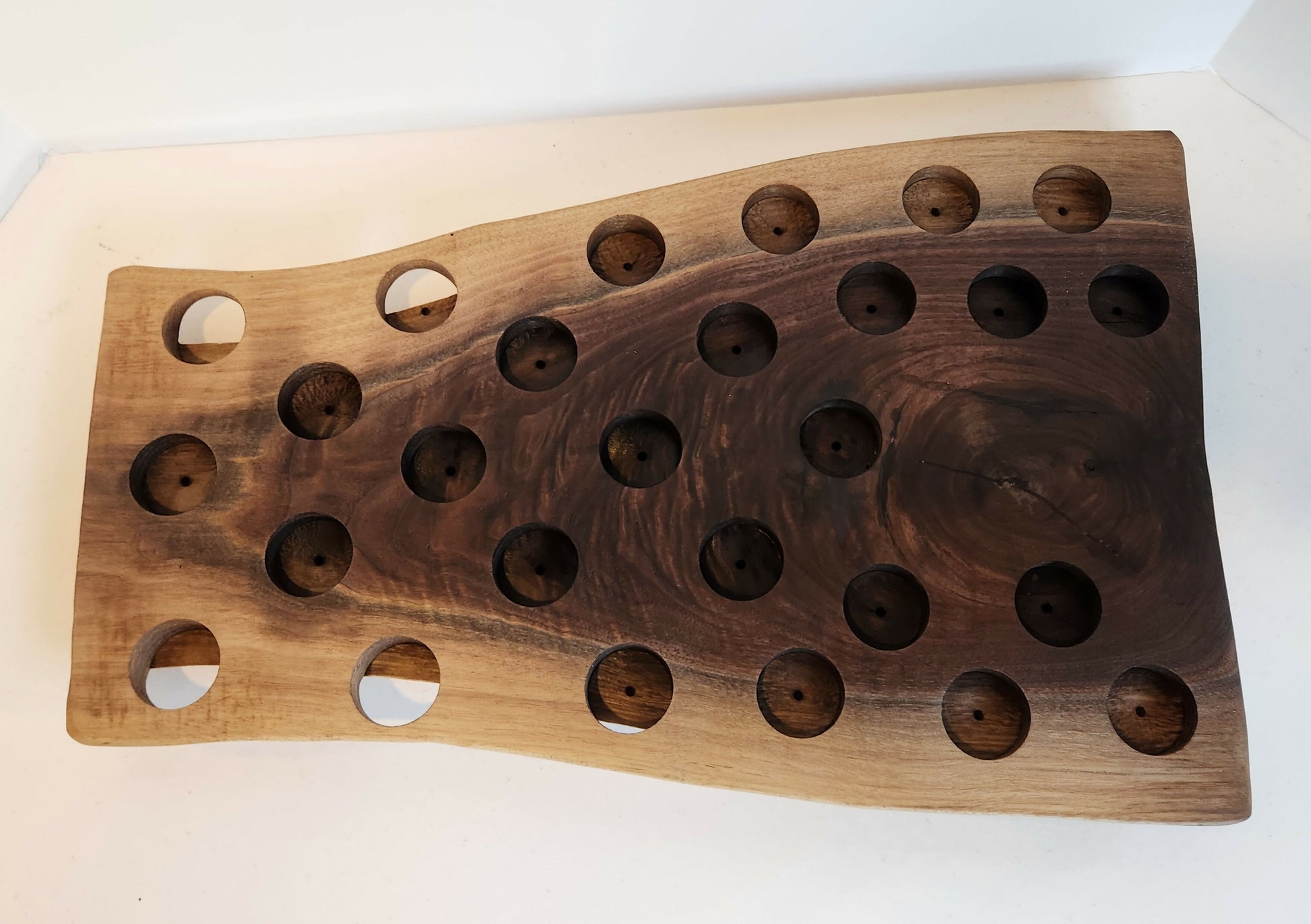 Solid Walnut Char-shooterie board 20"x 13" x2" thick. Be a big hit at your next party. Holds up to 27 mini bottles or shot glasses. Personalization (laser engraving) available for additional fee.
