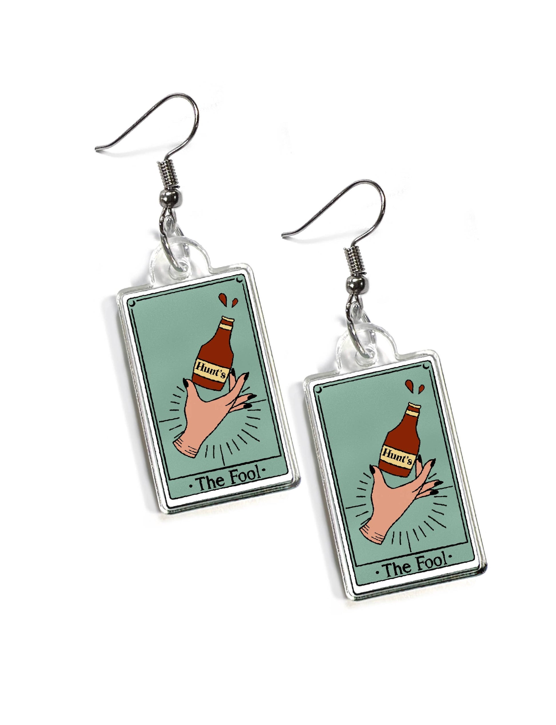 These delightfully detailed earrings Feature a Tarot card that says the Fool with a bottle of Hunts ketchup. Perfect for the Pittsburgh fan! Each adorable charm is just under 1.25 inch.