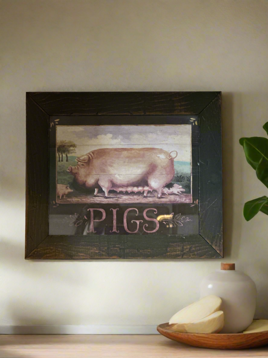 Primitive Pigs Picture Destressed 12.5 x 11 Frame With Glass Farmhouse Style