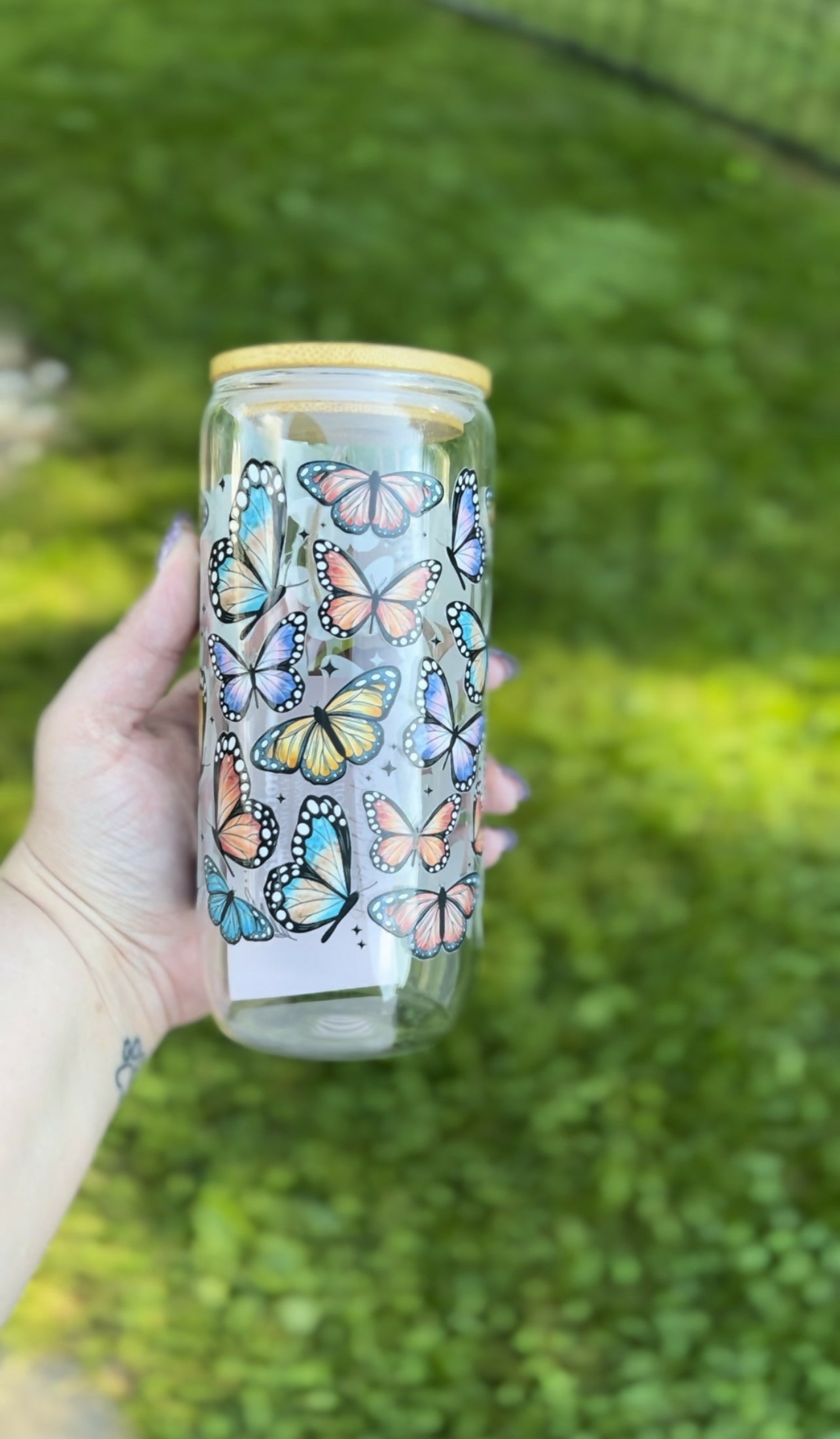 20 oz glass can tumbler with a rainbow butterfly wrap.