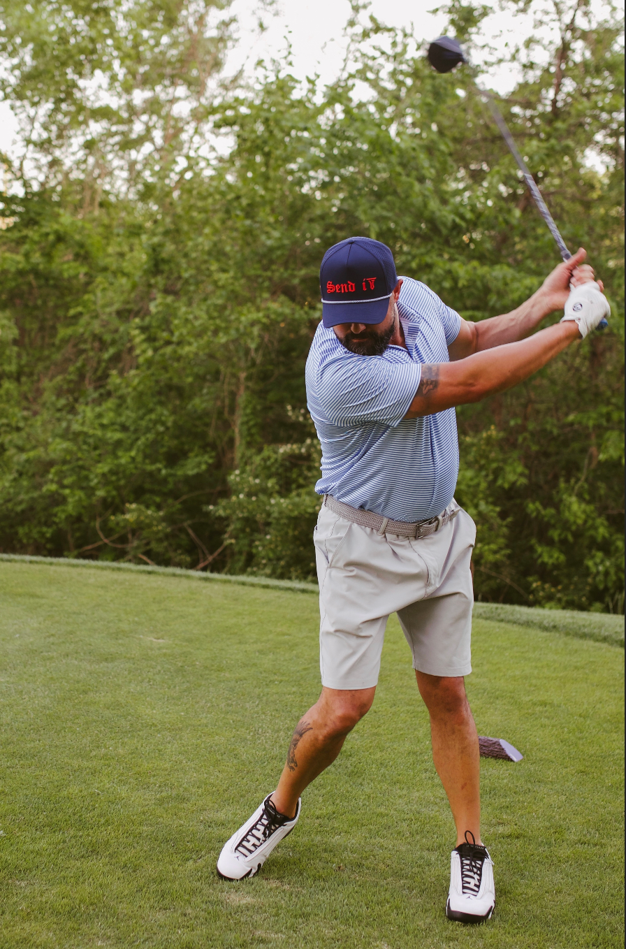 Make a bold statement on the course with our sleek Send It Hat in classic black. This 5-panel design combines style with functionality, keeping the sun out of your eyes while you focus on your swing. Perfect for golfers who aren't afraid to take risks and "send it" down the fairway. Elevate your golf attire today.
