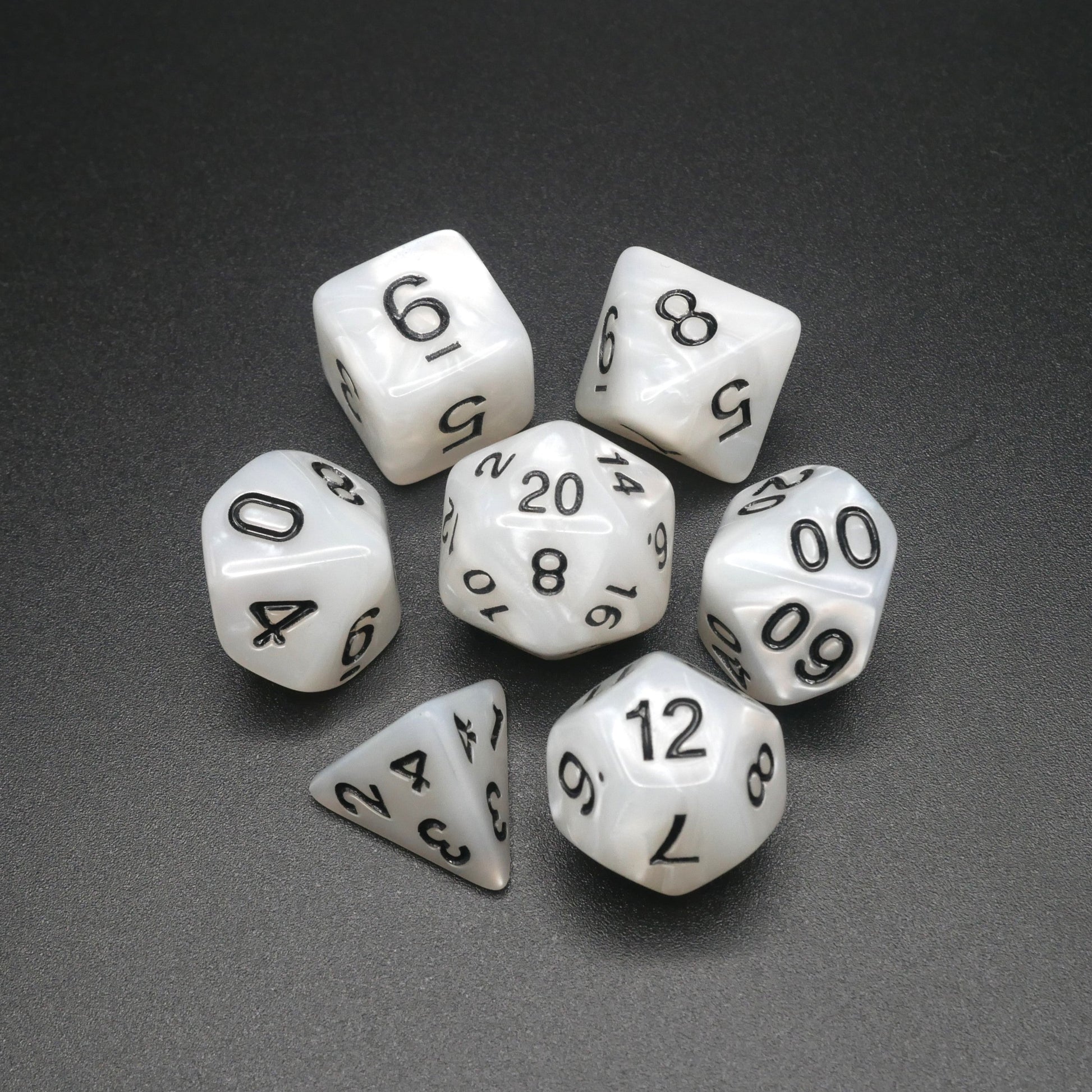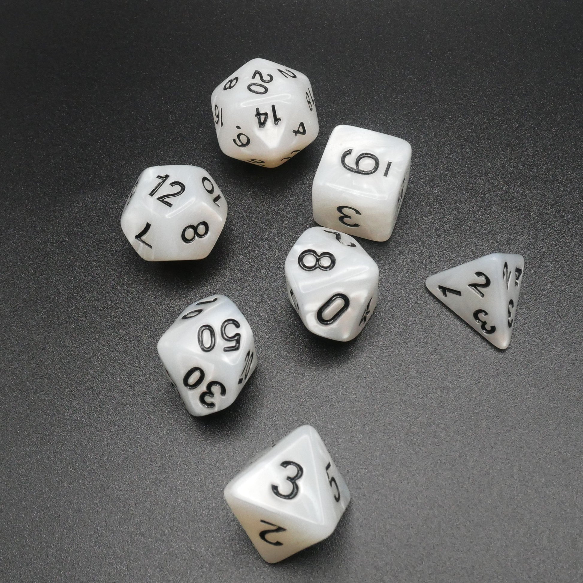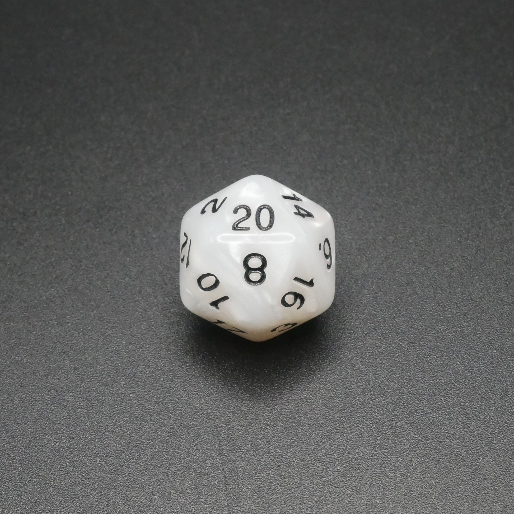 Marbled white dice with black numbers.