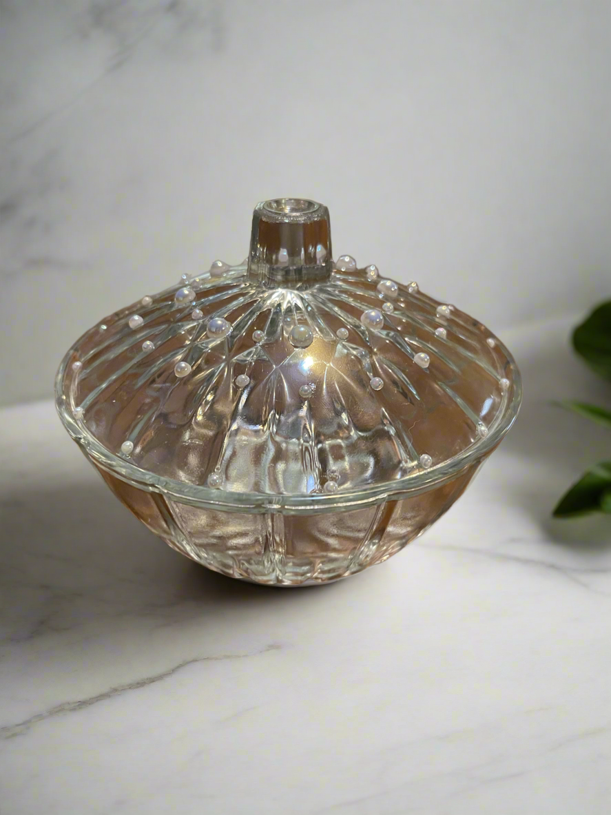 - Unique Design: A rare Depression glass piece elevated with hand-applied pearls for a sophisticated finish.