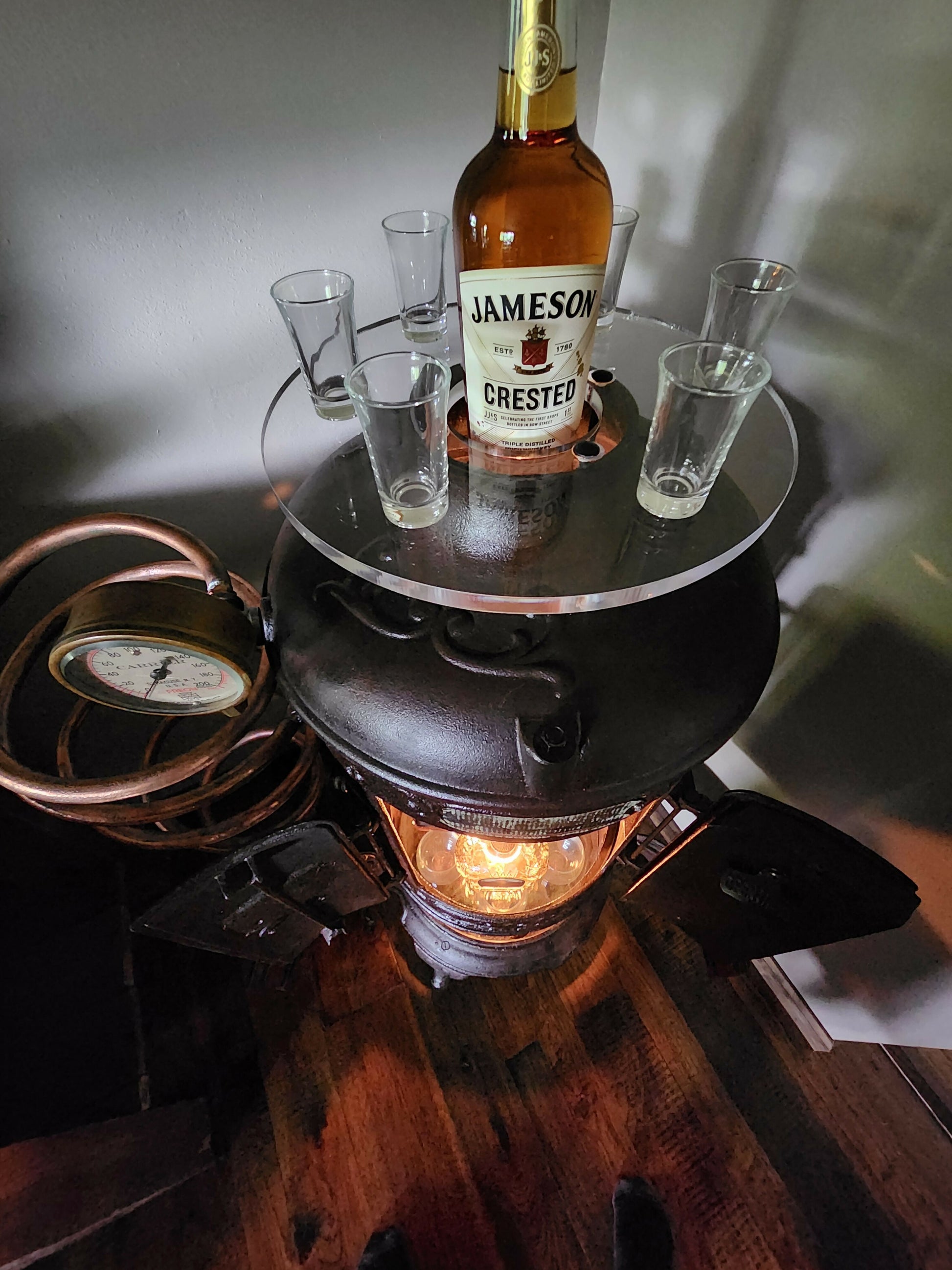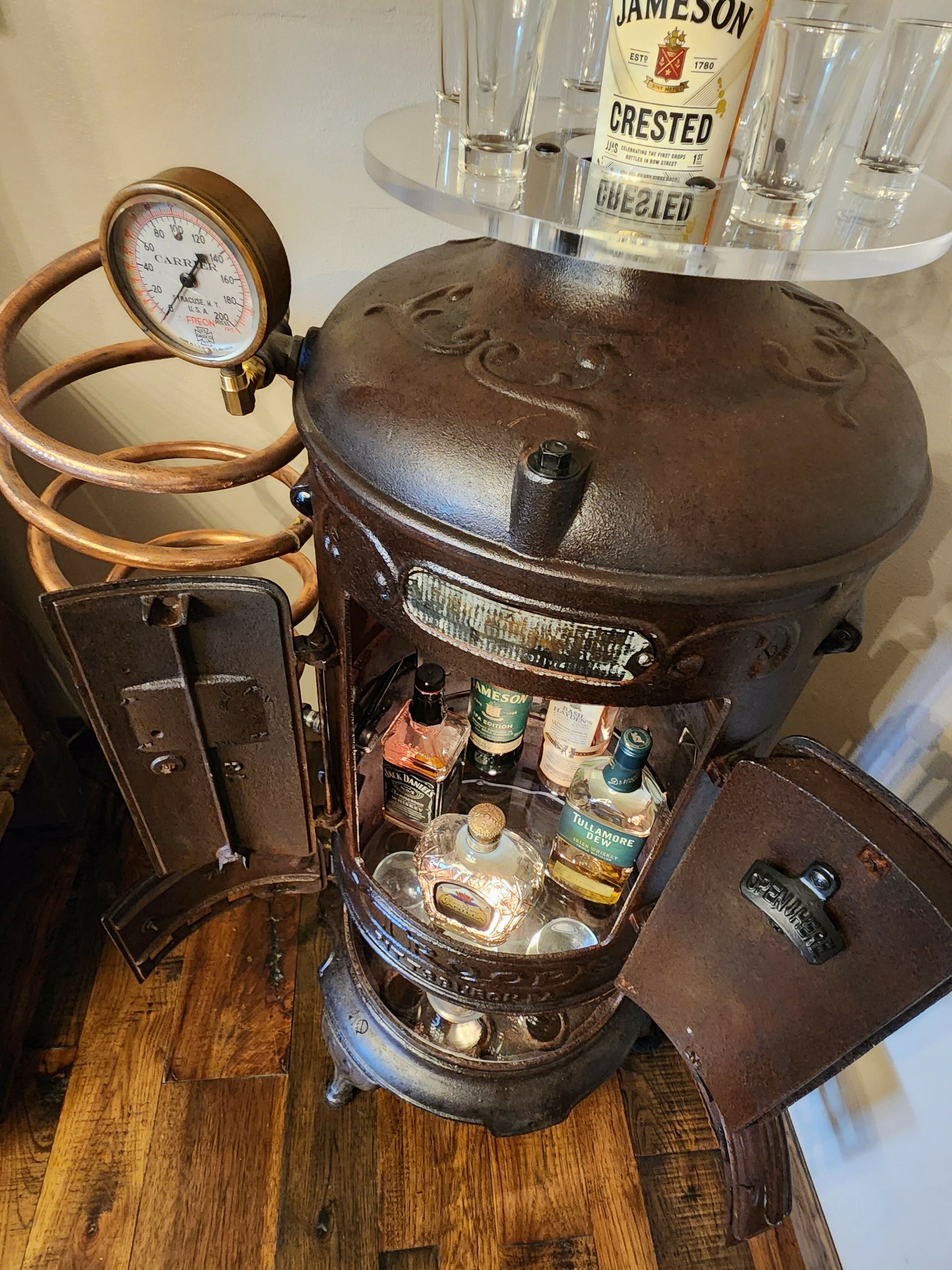 Vintage cast iron water heater manufactured by the Troop company in the early 1900's. Completely disassembled, cleaned and a top coat applied to seal in all the amazing patina. We added a few acrylic shelves and a remote lighting system to really set the mood. Dimensions: 30" wide x 46" tall. 16" internal radius.