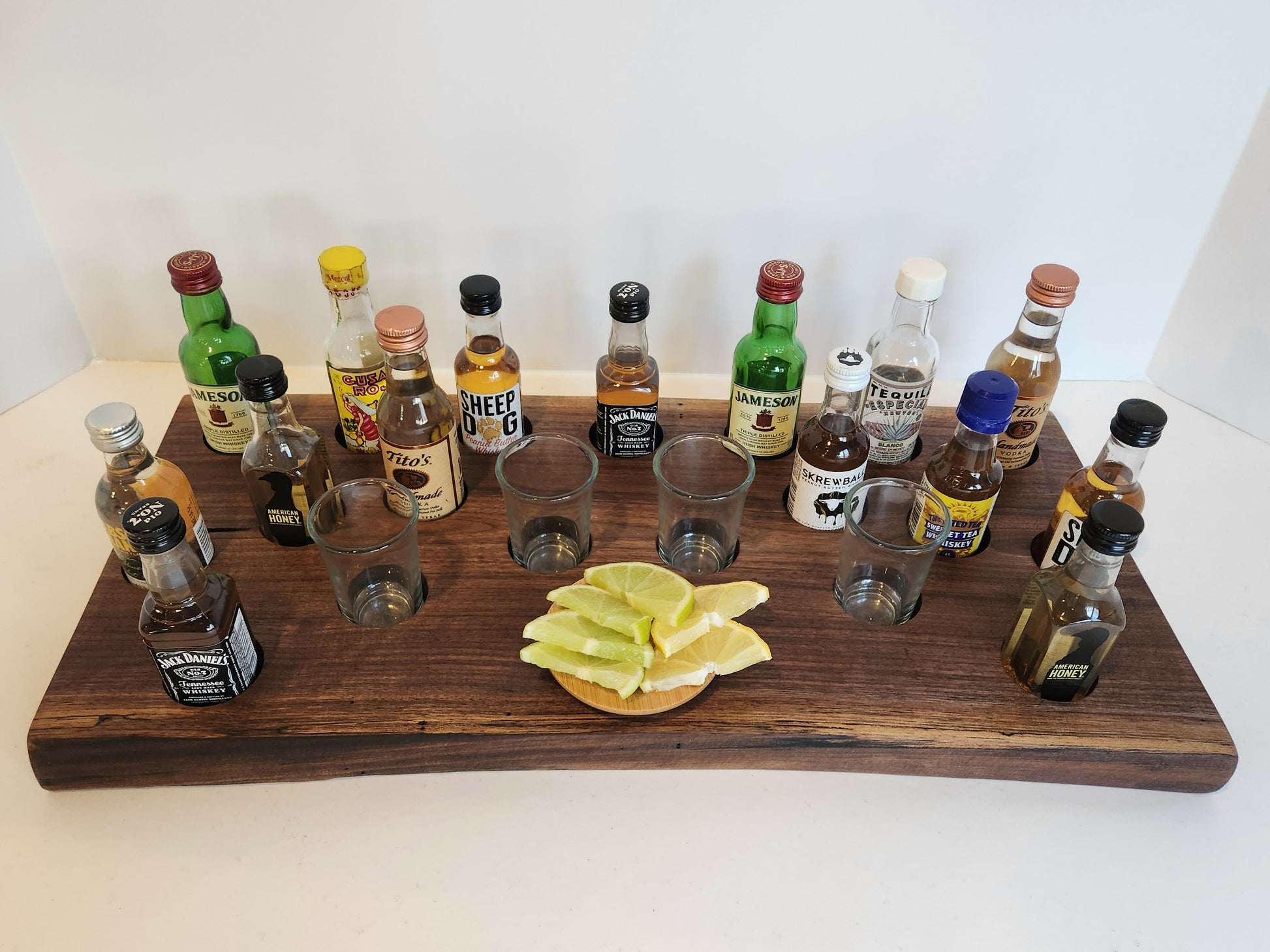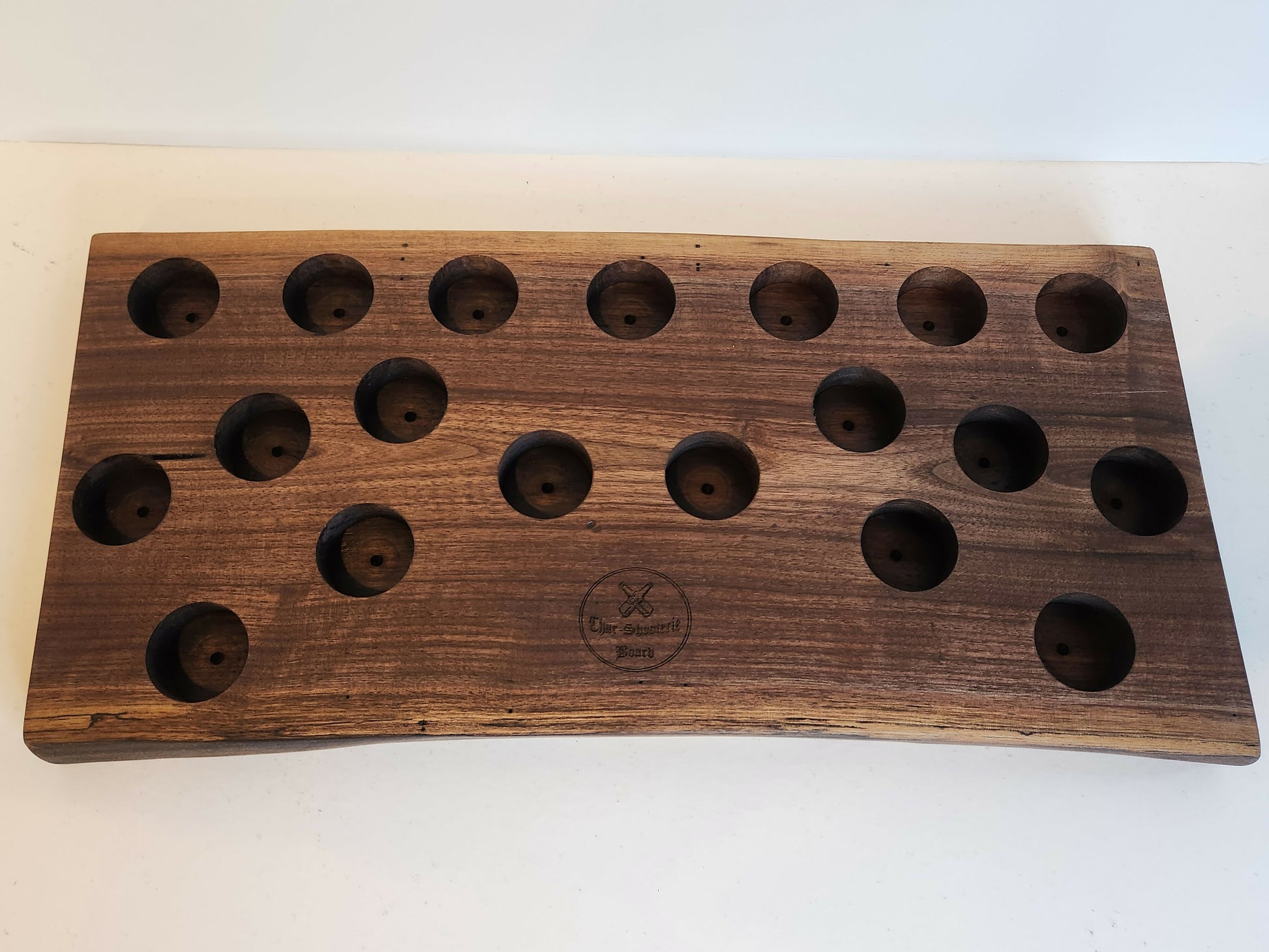 Solid Padauk Char-shooterie board 18"x8.5"x1" thick. Be a big hit at your next party. Holds up to 19 mini bottles or shot glasses. Personalization (laser engraving) available for additional fee.