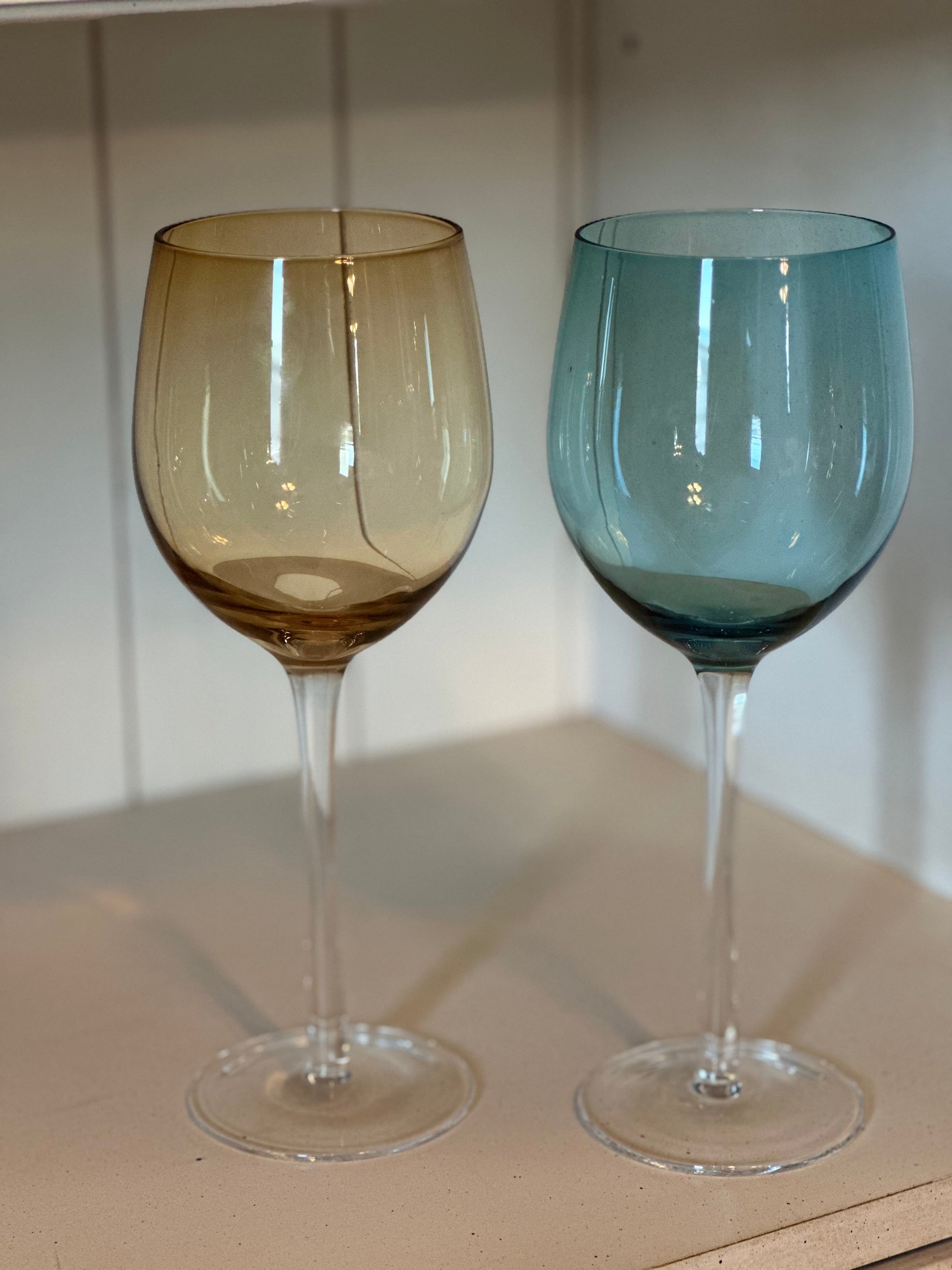 Set of 2 Multicolor Tall Wine Glasses, Vintage Multi Color Blue & Gold.
