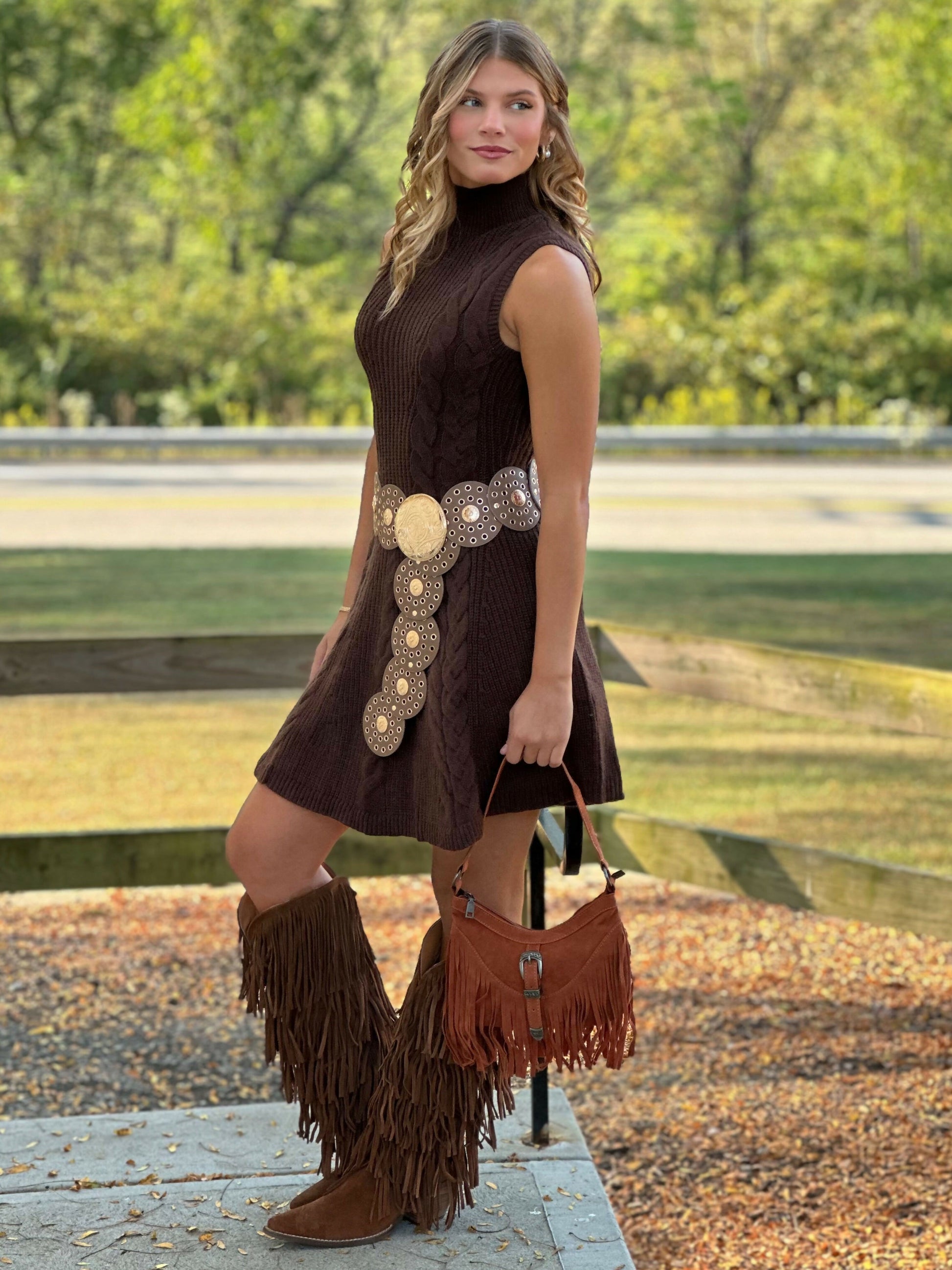 - Details: Cinched Waist, Mini, Turtleneck, Sleeveless, Knitted, Sweater.